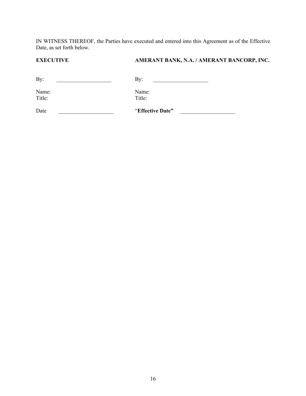 16 IN WITNESS THEREOF, the Parties have executed and entered into this Agreement as of the Effective Date, as set forth below. EXECUTIVE AMERANT BANK, N.A. / AMERANT BANCORP, INC. By: ____________________ By: ____________________ Name: Name: Title: Title: Date ____________________ “Effective Date” ____________________