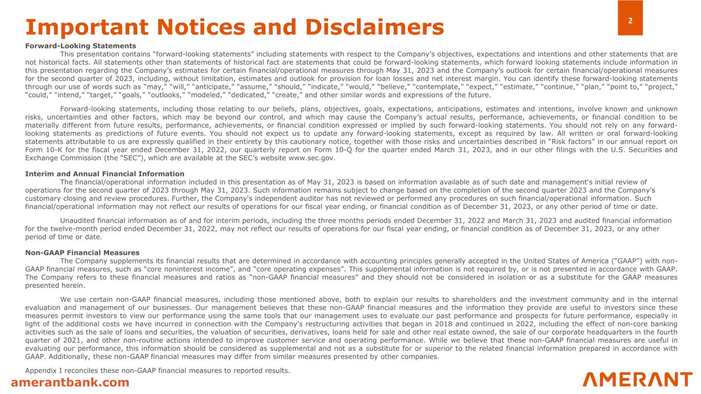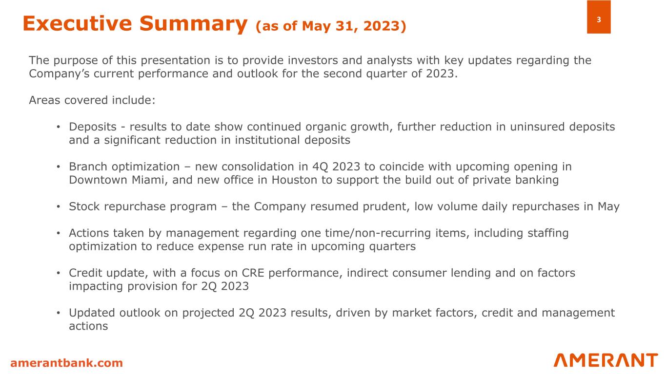 2 amerantbank.com Important Notices and Disclaimers Forward-Looking Statements This presentation contains “forward-looking statements” including statements with respect to the Company’s objectives, expectations and intentions and other statements that are not historical facts. All statements other than statements of historical fact are statements that could be forward-looking statements, which forward looking statements include information in this presentation regarding the Company’s estimates for certain financial/operational measures through May 31, 2023 and the Company’s outlook for certain financial/operational measures for the second quarter of 2023, including, without limitation, estimates and outlook for provision for loan losses and net interest margin. You can identify these forward-looking statements through our use of words such as “may,” “will,” “anticipate,” “assume,” “should,” “indicate,” “would,” “believe,” “contemplate,” “expect,” “estimate,” “continue,” “plan,” “point to,” “project,” “could,” “intend,” “target,” “goals,” “outlooks,” “modeled,” “dedicated,” “create,” and other similar words and expressions of the future. Forward-looking statements, including those relating to our beliefs, plans, objectives, goals, expectations, anticipations, estimates and intentions, involve known and unknown risks, uncertainties and other factors, which may be beyond our control, and which may cause the Company’s actual results, performance, achievements, or financial condition to be materially different from future results, performance, achievements, or financial condition expressed or implied by such forward-looking statements. You should not rely on any forward- looking statements as predictions of future events. You should not expect us to update any forward-looking statements, except as required by law. All written or oral forward-looking statements attributable to us are expressly qualified in their entirety by this cautionary notice, together with those risks and uncertainties described in “Risk factors” in our annual report on Form 10-K for the fiscal year ended December 31, 2022, our quarterly report on Form 10-Q for the quarter ended March 31, 2023, and in our other filings with the U.S. Securities and Exchange Commission (the “SEC”), which are available at the SEC’s website www.sec.gov. Interim and Annual Financial Information The financial/operational information included in this presentation as of May 31, 2023 is based on information available as of such date and management's initial review of operations for the second quarter of 2023 through May 31, 2023. Such information remains subject to change based on the completion of the second quarter 2023 and the Company's customary closing and review procedures. Further, the Company's independent auditor has not reviewed or performed any procedures on such financial/operational information. Such financial/operational information may not reflect our results of operations for our fiscal year ending, or financial condition as of December 31, 2023, or any other period of time or date. Unaudited financial information as of and for interim periods, including the three months periods ended December 31, 2022 and March 31, 2023 and audited financial information for the twelve-month period ended December 31, 2022, may not reflect our results of operations for our fiscal year ending, or financial condition as of December 31, 2023, or any other period of time or date. Non-GAAP Financial Measures The Company supplements its financial results that are determined in accordance with accounting principles generally accepted in the United States of America (“GAAP”) with non- GAAP financial measures, such as “core noninterest income”, and “core operating expenses”. This supplemental information is not required by, or is not presented in accordance with GAAP. The Company refers to these financial measures and ratios as “non-GAAP financial measures” and they should not be considered in isolation or as a substitute for the GAAP measures presented herein. We use certain non-GAAP financial measures, including those mentioned above, both to explain our results to shareholders and the investment community and in the internal evaluation and management of our businesses. Our management believes that these non-GAAP financial measures and the information they provide are useful to investors since these measures permit investors to view our performance using the same tools that our management uses to evaluate our past performance and prospects for future performance, especially in light of the additional costs we have incurred in connection with the Company’s restructuring activities that began in 2018 and continued in 2022, including the effect of non-core banking activities such as the sale of loans and securities, the valuation of securities, derivatives, loans held for sale and other real estate owned, the sale of our corporate headquarters in the fourth quarter of 2021, and other non-routine actions intended to improve customer service and operating performance. While we believe that these non-GAAP financial measures are useful in evaluating our performance, this information should be considered as supplemental and not as a substitute for or superior to the related financial information prepared in accordance with GAAP. Additionally, these non-GAAP financial measures may differ from similar measures presented by other companies. Appendix I reconciles these non-GAAP financial measures to reported results.