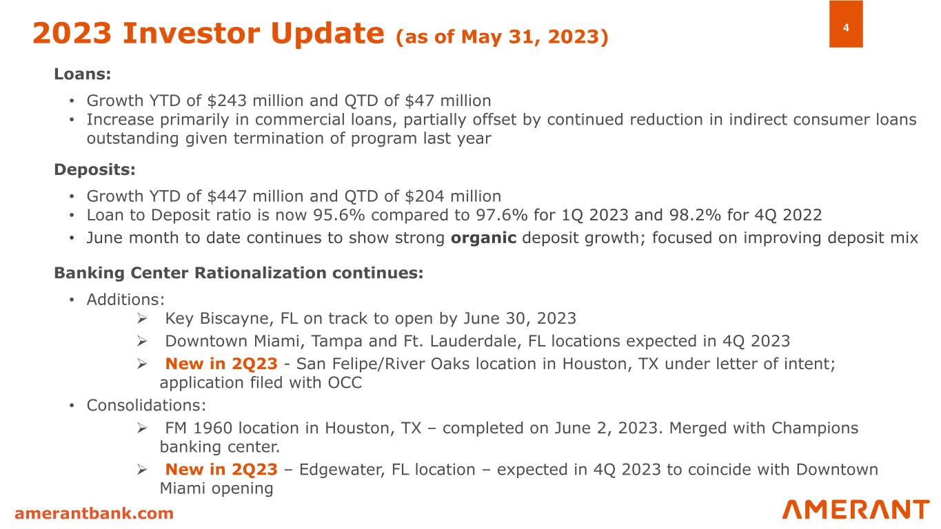 3 amerantbank.com Executive Summary (as of May 31, 2023) The purpose of this presentation is to provide investors and analysts with key updates regarding the Company’s current performance and outlook for the second quarter of 2023. Areas covered include: • Deposits - results to date show continued organic growth, further reduction in uninsured deposits and a significant reduction in institutional deposits • Branch optimization – new consolidation in 4Q 2023 to coincide with upcoming opening in Downtown Miami, and new office in Houston to support the build out of private banking • Stock repurchase program – the Company resumed prudent, low volume daily repurchases in May • Actions taken by management regarding one time/non-recurring items, including staffing optimization to reduce expense run rate in upcoming quarters • Credit update, with a focus on CRE performance, indirect consumer lending and on factors impacting provision for 2Q 2023 • Updated outlook on projected 2Q 2023 results, driven by market factors, credit and management actions