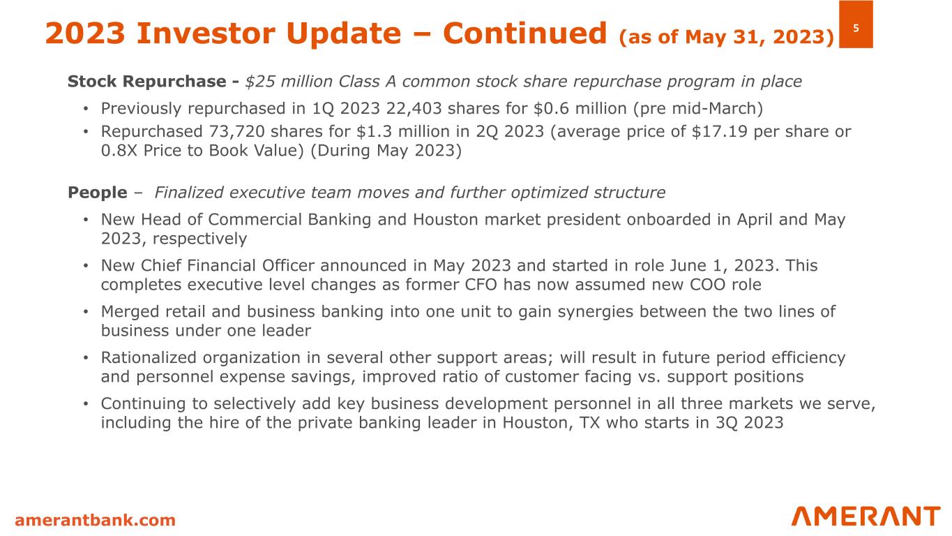 4 amerantbank.com 2023 Investor Update (as of May 31, 2023) Loans: • Growth YTD of $243 million and QTD of $47 million • Increase primarily in commercial loans, partially offset by continued reduction in indirect consumer loans outstanding given termination of program last year Deposits: • Growth YTD of $447 million and QTD of $204 million • Loan to Deposit ratio is now 95.6% compared to 97.6% for 1Q 2023 and 98.2% for 4Q 2022 • June month to date continues to show strong organic deposit growth; focused on improving deposit mix Banking Center Rationalization continues: • Additions:  Key Biscayne, FL on track to open by June 30, 2023  Downtown Miami, Tampa and Ft. Lauderdale, FL locations expected in 4Q 2023  New in 2Q23 - San Felipe/River Oaks location in Houston, TX under letter of intent; application filed with OCC • Consolidations:  FM 1960 location in Houston, TX – completed on June 2, 2023. Merged with Champions banking center.  New in 2Q23 – Edgewater, FL location – expected in 4Q 2023 to coincide with Downtown Miami opening