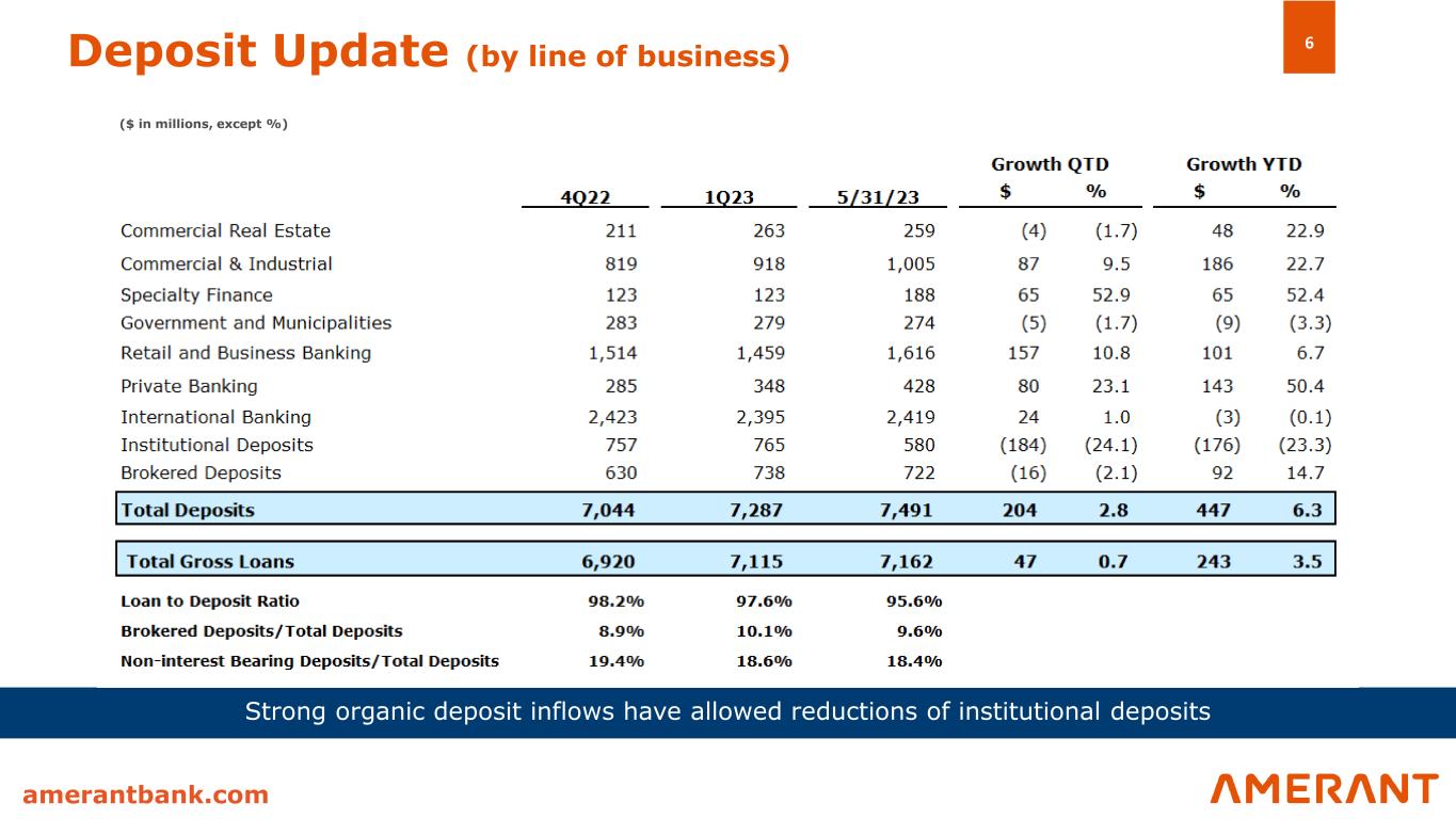 5 amerantbank.com 2023 Investor Update – Continued (as of May 31, 2023) Stock Repurchase - $25 million Class A common stock share repurchase program in place • Previously repurchased in 1Q 2023 22,403 shares for $0.6 million (pre mid-March) • Repurchased 73,720 shares for $1.3 million in 2Q 2023 (average price of $17.19 per share or 0.8X Price to Book Value) (During May 2023) People – Finalized executive team moves and further optimized structure • New Head of Commercial Banking and Houston market president onboarded in April and May 2023, respectively • New Chief Financial Officer announced in May 2023 and started in role June 1, 2023. This completes executive level changes as former CFO has now assumed new COO role • Merged retail and business banking into one unit to gain synergies between the two lines of business under one leader • Rationalized organization in several other support areas; will result in future period efficiency and personnel expense savings, improved ratio of customer facing vs. support positions • Continuing to selectively add key business development personnel in all three markets we serve, including the hire of the private banking leader in Houston, TX who starts in 3Q 2023