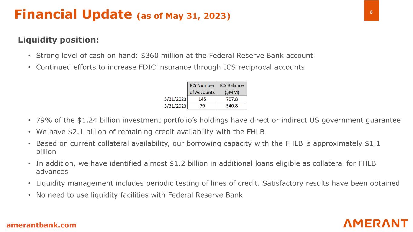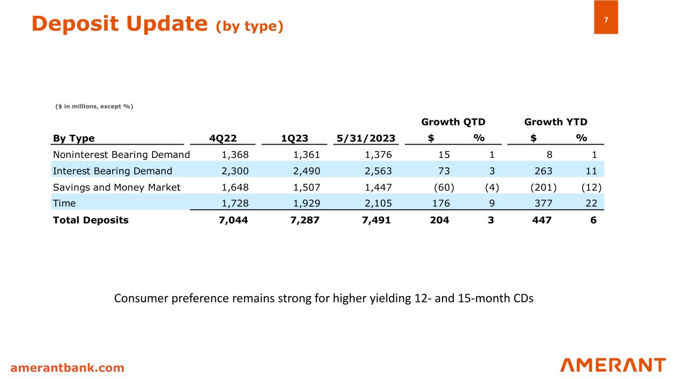 7 amerantbank.com Deposit Update (by type) ($ in millions, except %) $ % $ % Noninterest Bearing Demand 1,368 1,361 1,376 15 1 8 1 Interest Bearing Demand 2,300 2,490 2,563 73 3 263 11 Savings and Money Market 1,648 1,507 1,447 (60) (4) (201) (12) Time 1,728 1,929 2,105 176 9 377 22 Total Deposits 7,044 7,287 7,491 204 3 447 6 Growth YTD By Type 5/31/20231Q234Q22 Growth QTD Consumer preference remains strong for higher yielding 12- and 15-month CDs