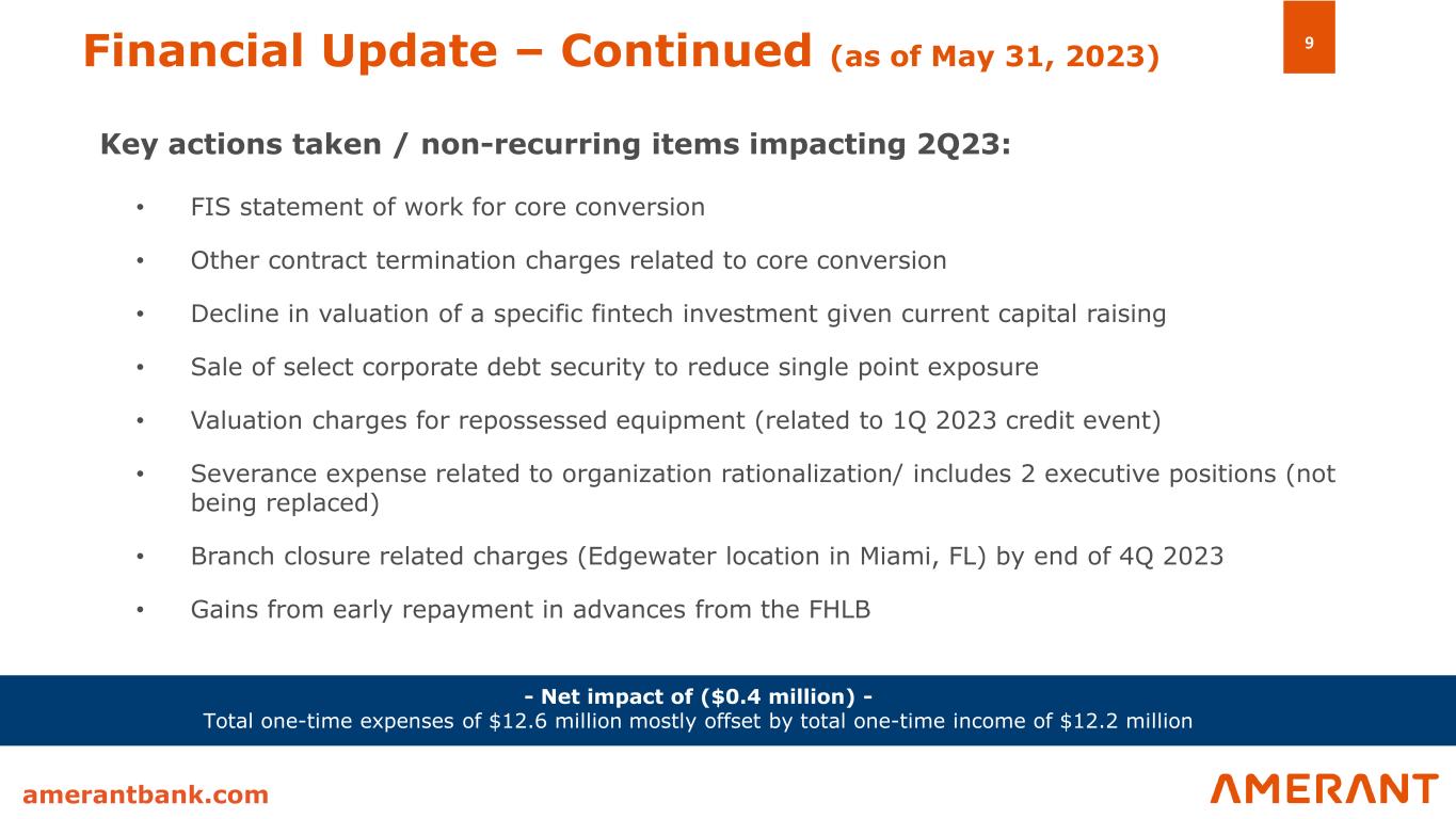 8 amerantbank.com Financial Update (as of May 31, 2023) Liquidity position: • Strong level of cash on hand: $360 million at the Federal Reserve Bank account • Continued efforts to increase FDIC insurance through ICS reciprocal accounts • 79% of the $1.24 billion investment portfolio’s holdings have direct or indirect US government guarantee • We have $2.1 billion of remaining credit availability with the FHLB • Based on current collateral availability, our borrowing capacity with the FHLB is approximately $1.1 billion • In addition, we have identified almost $1.2 billion in additional loans eligible as collateral for FHLB advances • Liquidity management includes periodic testing of lines of credit. Satisfactory results have been obtained • No need to use liquidity facilities with Federal Reserve Bank