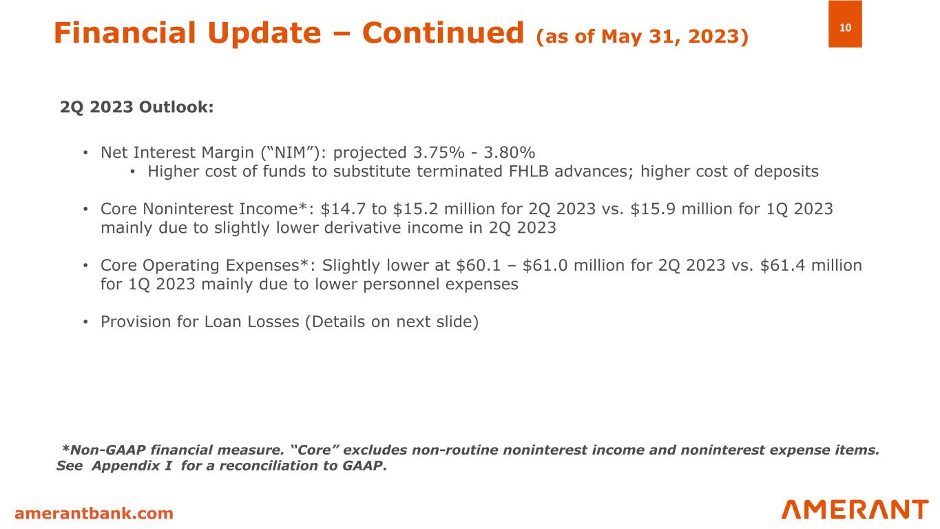 9 amerantbank.com Financial Update – Continued (as of May 31, 2023) Key actions taken / non-recurring items impacting 2Q23: • FIS statement of work for core conversion • Other contract termination charges related to core conversion • Decline in valuation of a specific fintech investment given current capital raising • Sale of select corporate debt security to reduce single point exposure • Valuation charges for repossessed equipment (related to 1Q 2023 credit event) • Severance expense related to organization rationalization/ includes 2 executive positions (not being replaced) • Branch closure related charges (Edgewater location in Miami, FL) by end of 4Q 2023 • Gains from early repayment in advances from the FHLB - Net impact of ($0.4 million) - Total one-time expenses of $12.6 million mostly offset by total one-time income of $12.2 million