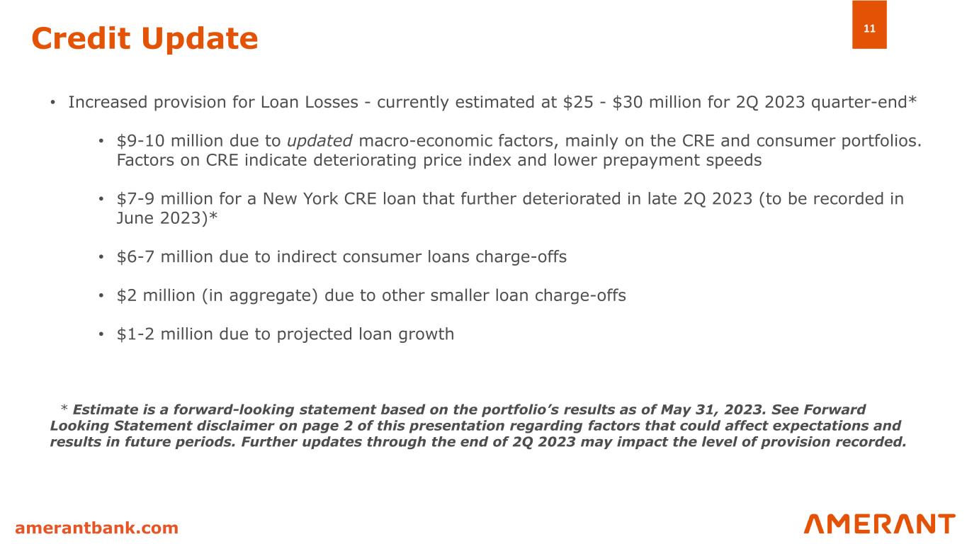 10 amerantbank.com Financial Update – Continued (as of May 31, 2023) 2Q 2023 Outlook: • Net Interest Margin (“NIM”): projected 3.75% - 3.80% • Higher cost of funds to substitute terminated FHLB advances; higher cost of deposits • Core Noninterest Income*: $14.7 to $15.2 million for 2Q 2023 vs. $15.9 million for 1Q 2023 mainly due to slightly lower derivative income in 2Q 2023 • Core Operating Expenses*: Slightly lower at $60.1 – $61.0 million for 2Q 2023 vs. $61.4 million for 1Q 2023 mainly due to lower personnel expenses • Provision for Loan Losses (Details on next slide) *Non-GAAP financial measure. “Core” excludes non-routine noninterest income and noninterest expense items. See Appendix I for a reconciliation to GAAP.