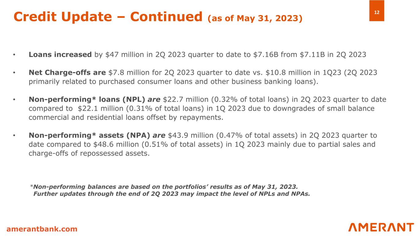 11 amerantbank.com Credit Update • Increased provision for Loan Losses - currently estimated at $25 - $30 million for 2Q 2023 quarter-end* • $9-10 million due to updated macro-economic factors, mainly on the CRE and consumer portfolios. Factors on CRE indicate deteriorating price index and lower prepayment speeds • $7-9 million for a New York CRE loan that further deteriorated in late 2Q 2023 (to be recorded in June 2023)* • $6-7 million due to indirect consumer loans charge-offs • $2 million (in aggregate) due to other smaller loan charge-offs • $1-2 million due to projected loan growth * Estimate is a forward-looking statement based on the portfolio’s results as of May 31, 2023. See Forward Looking Statement disclaimer on page 2 of this presentation regarding factors that could affect expectations and results in future periods. Further updates through the end of 2Q 2023 may impact the level of provision recorded.