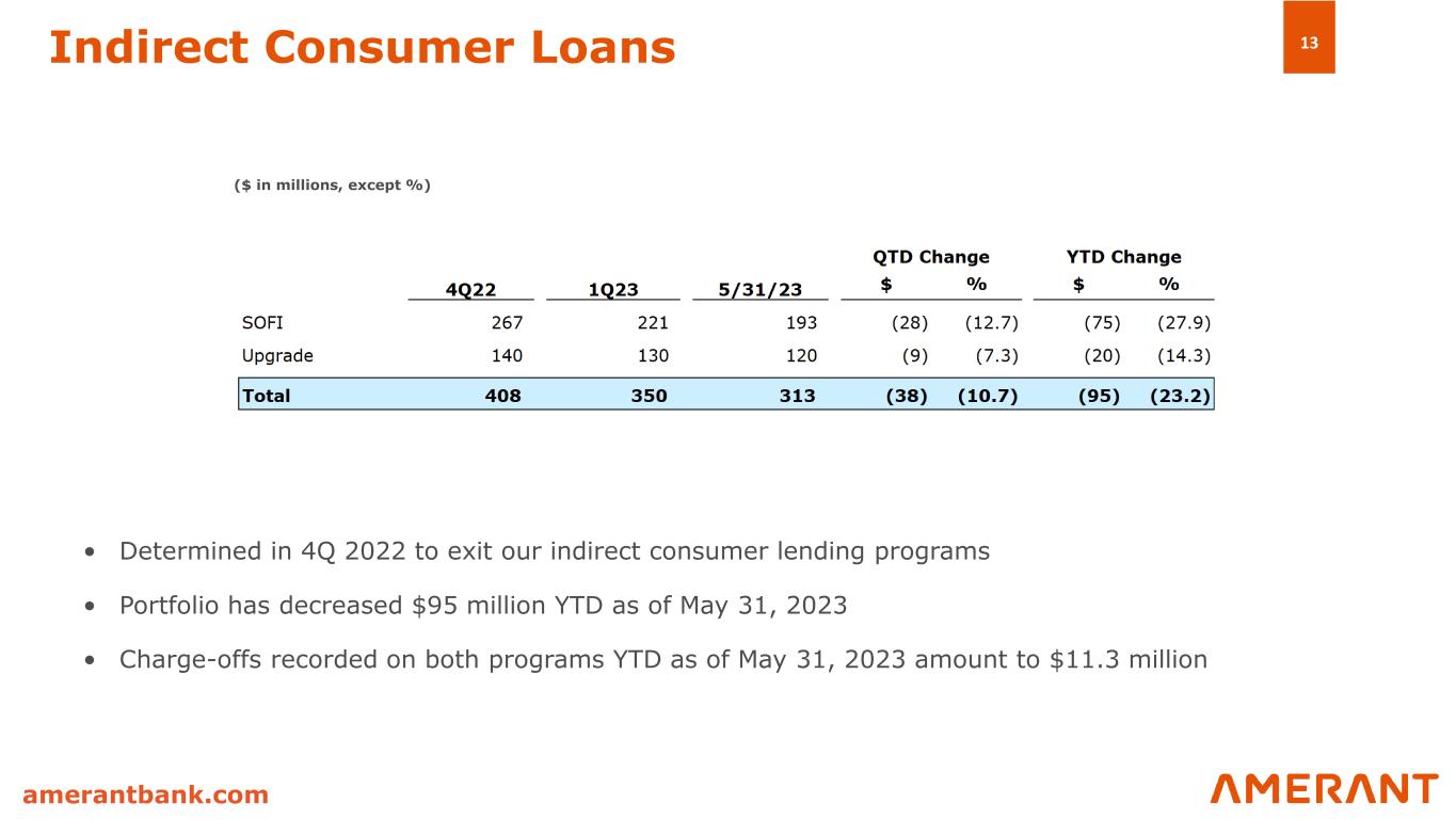 12 amerantbank.com Credit Update – Continued (as of May 31, 2023) • Loans increased by $47 million in 2Q 2023 quarter to date to $7.16B from $7.11B in 2Q 2023 • Net Charge-offs are $7.8 million for 2Q 2023 quarter to date vs. $10.8 million in 1Q23 (2Q 2023 primarily related to purchased consumer loans and other business banking loans). • Non-performing* loans (NPL) are $22.7 million (0.32% of total loans) in 2Q 2023 quarter to date compared to $22.1 million (0.31% of total loans) in 1Q 2023 due to downgrades of small balance commercial and residential loans offset by repayments. • Non-performing* assets (NPA) are $43.9 million (0.47% of total assets) in 2Q 2023 quarter to date compared to $48.6 million (0.51% of total assets) in 1Q 2023 mainly due to partial sales and charge-offs of repossessed assets. *Non-performing balances are based on the portfolios’ results as of May 31, 2023. Further updates through the end of 2Q 2023 may impact the level of NPLs and NPAs.
