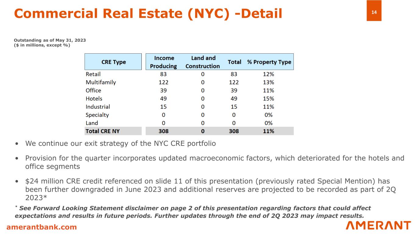 13 amerantbank.com Indirect Consumer Loans ($ in millions, except %) • Determined in 4Q 2022 to exit our indirect consumer lending programs • Portfolio has decreased $95 million YTD as of May 31, 2023 • Charge-offs recorded on both programs YTD as of May 31, 2023 amount to $11.3 million