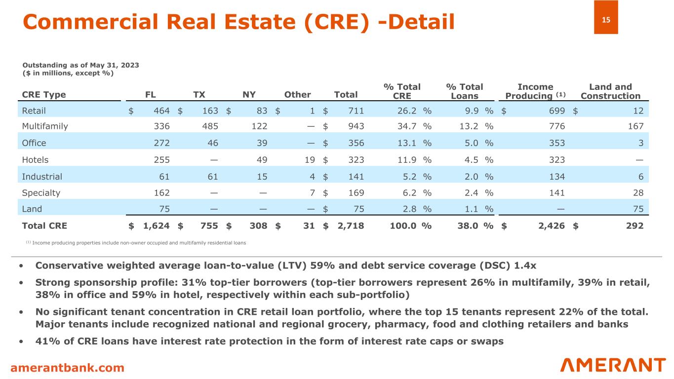 14 amerantbank.com Commercial Real Estate (NYC) -Detail Outstanding as of May 31, 2023 ($ in millions, except %) • We continue our exit strategy of the NYC CRE portfolio • Provision for the quarter incorporates updated macroeconomic factors, which deteriorated for the hotels and office segments • $24 million CRE credit referenced on slide 11 of this presentation (previously rated Special Mention) has been further downgraded in June 2023 and additional reserves are projected to be recorded as part of 2Q 2023* * See Forward Looking Statement disclaimer on page 2 of this presentation regarding factors that could affect expectations and results in future periods. Further updates through the end of 2Q 2023 may impact results.