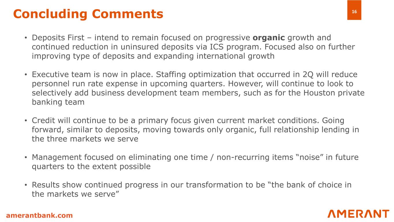 16 amerantbank.com Concluding Comments • Deposits First – intend to remain focused on progressive organic growth and continued reduction in uninsured deposits via ICS program. Focused also on further improving type of deposits and expanding international growth • Executive team is now in place. Staffing optimization that occurred in 2Q will reduce personnel run rate expense in upcoming quarters. However, will continue to look to selectively add business development team members, such as for the Houston private banking team • Credit will continue to be a primary focus given current market conditions. Going forward, similar to deposits, moving towards only organic, full relationship lending in the three markets we serve • Management focused on eliminating one time / non-recurring items “noise” in future quarters to the extent possible • Results show continued progress in our transformation to be “the bank of choice in the markets we serve”