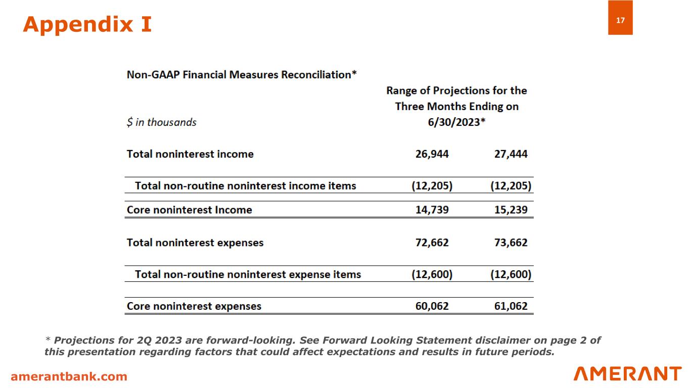 17 amerantbank.com Appendix I * Projections for 2Q 2023 are forward-looking. See Forward Looking Statement disclaimer on page 2 of this presentation regarding factors that could affect expectations and results in future periods.