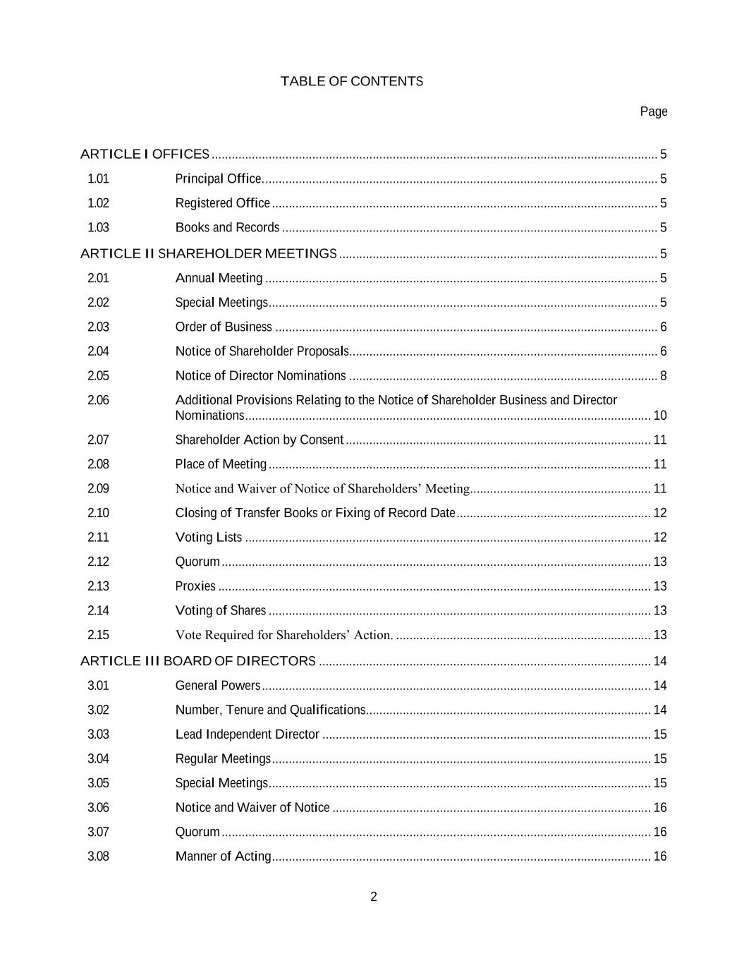 2 TABLE OF CONTENTS Page ARTICLE I OFFICES ..................................................................................................................................... 5 1.01 Principal Office. ..................................................................................................................... 5 1.02 Registered Office ................................................................................................................... 5 1.03 Books and Records ................................................................................................................ 5 ARTICLE II SHAREHOLDER MEETINGS ............................................................................................... 5 2.01 Annual Meeting ..................................................................................................................... 5 2.02 Special Meetings .................................................................................................................... 5 2.03 Order of Business .................................................................................................................. 6 2.04 Notice of Shareholder Proposals ............................................................................................ 6 2.05 Notice of Director Nominations ............................................................................................ 8 2.06 Additional Provisions Relating to the Notice of Shareholder Business and Director Nominations ......................................................................................................................... 10 2.07 Shareholder Action by Consent ........................................................................................... 11 2.08 Place of Meeting .................................................................................................................. 11 2.09 Notice and Waiver of Notice of Shareholders’ Meeting...................................................... 11 2.10 Closing of Transfer Books or Fixing of Record Date .......................................................... 12 2.11 Voting Lists ......................................................................................................................... 12 2.12 Quorum ................................................................................................................................ 13 2.13 Proxies ................................................................................................................................. 13 2.14 Voting of Shares .................................................................................................................. 13 2.15 Vote Required for Shareholders’ Action. ............................................................................ 13 ARTICLE III BOARD OF DIRECTORS ................................................................................................... 14 3.01 General Powers .................................................................................................................... 14 3.02 Number, Tenure and Qualifications ..................................................................................... 14 3.03 Lead Independent Director .................................................................................................. 15 3.04 Regular Meetings ................................................................................................................. 15 3.05 Special Meetings .................................................................................................................. 15 3.06 Notice and Waiver of Notice ............................................................................................... 16 3.07 Quorum ................................................................................................................................ 16 3.08 Manner of Acting ................................................................................................................. 16