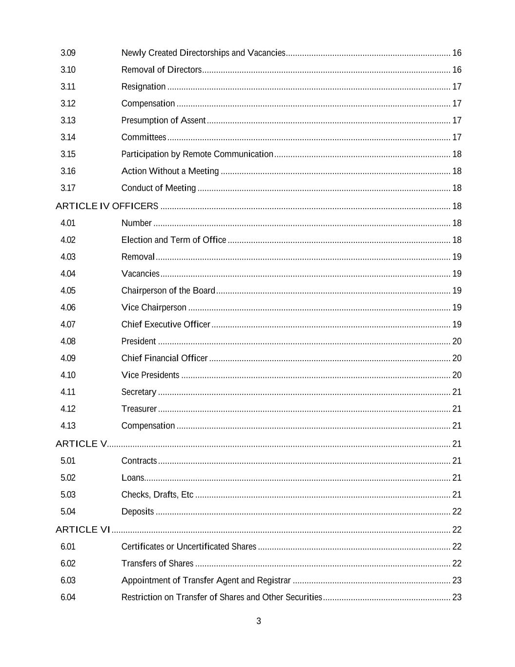 3 3.09 Newly Created Directorships and Vacancies ....................................................................... 16 3.10 Removal of Directors ........................................................................................................... 16 3.11 Resignation .......................................................................................................................... 17 3.12 Compensation ...................................................................................................................... 17 3.13 Presumption of Assent ......................................................................................................... 17 3.14 Committees .......................................................................................................................... 17 3.15 Participation by Remote Communication ............................................................................ 18 3.16 Action Without a Meeting ................................................................................................... 18 3.17 Conduct of Meeting ............................................................................................................. 18 ARTICLE IV OFFICERS ............................................................................................................................. 18 4.01 Number ................................................................................................................................ 18 4.02 Election and Term of Office ................................................................................................ 18 4.03 Removal ............................................................................................................................... 19 4.04 Vacancies ............................................................................................................................. 19 4.05 Chairperson of the Board ..................................................................................................... 19 4.06 Vice Chairperson ................................................................................................................. 19 4.07 Chief Executive Officer ....................................................................................................... 19 4.08 President .............................................................................................................................. 20 4.09 Chief Financial Officer ........................................................................................................ 20 4.10 Vice Presidents .................................................................................................................... 20 4.11 Secretary .............................................................................................................................. 21 4.12 Treasurer .............................................................................................................................. 21 4.13 Compensation ...................................................................................................................... 21 ARTICLE V .................................................................................................................................................... 21 5.01 Contracts .............................................................................................................................. 21 5.02 Loans.................................................................................................................................... 21 5.03 Checks, Drafts, Etc .............................................................................................................. 21 5.04 Deposits ............................................................................................................................... 22 ARTICLE VI .................................................................................................................................................. 22 6.01 Certificates or Uncertificated Shares ................................................................................... 22 6.02 Transfers of Shares .............................................................................................................. 22 6.03 Appointment of Transfer Agent and Registrar .................................................................... 23 6.04 Restriction on Transfer of Shares and Other Securities ....................................................... 23