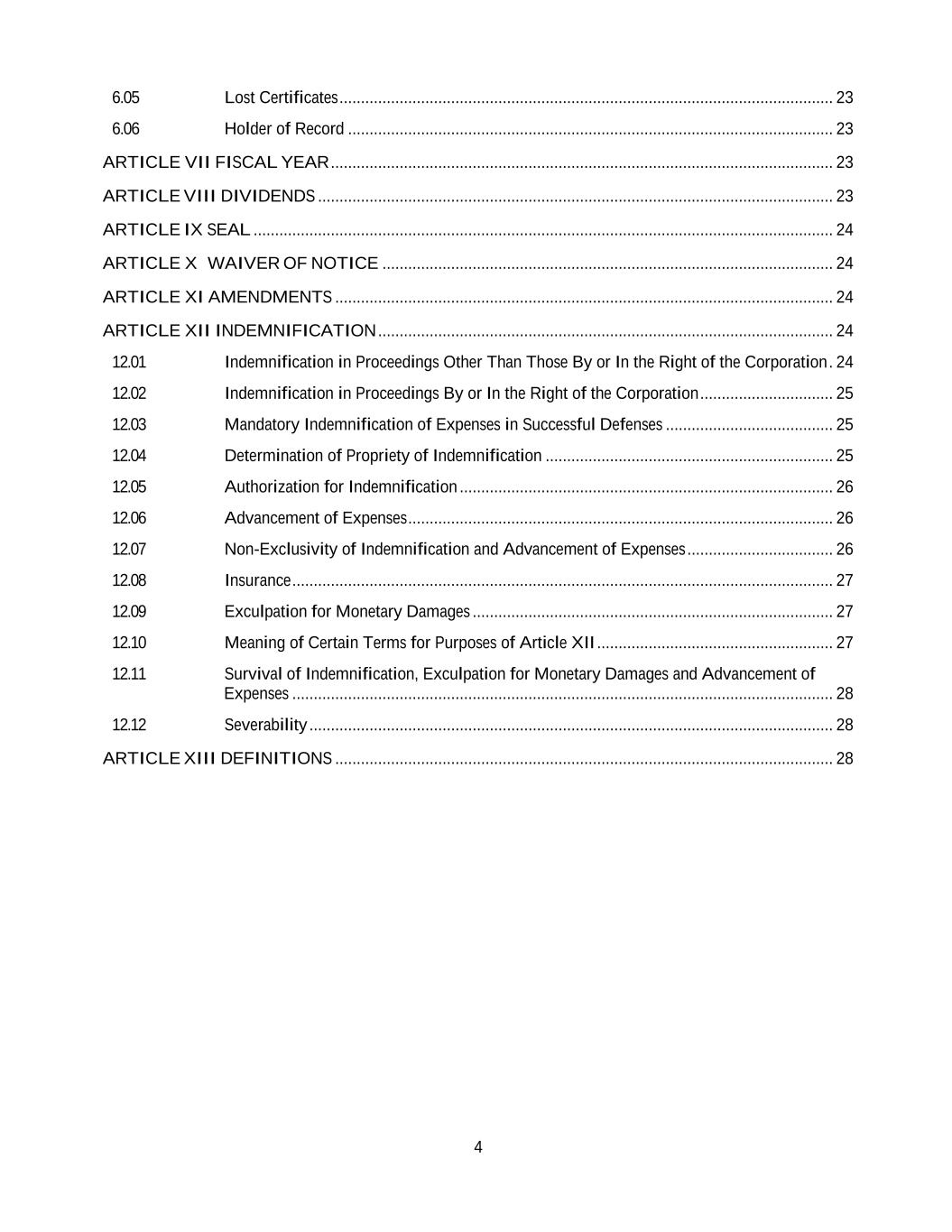 4 6.05 Lost Certificates ................................................................................................................... 23 6.06 Holder of Record ................................................................................................................. 23 ARTICLE VII FISCAL YEAR ..................................................................................................................... 23 ARTICLE VIII DIVIDENDS ........................................................................................................................ 23 ARTICLE IX SEAL ....................................................................................................................................... 24 ARTICLE X WAIVER OF NOTICE ......................................................................................................... 24 ARTICLE XI AMENDMENTS .................................................................................................................... 24 ARTICLE XII INDEMNIFICATION .......................................................................................................... 24 12.01 Indemnification in Proceedings Other Than Those By or In the Right of the Corporation . 24 12.02 Indemnification in Proceedings By or In the Right of the Corporation ............................... 25 12.03 Mandatory Indemnification of Expenses in Successful Defenses ....................................... 25 12.04 Determination of Propriety of Indemnification ................................................................... 25 12.05 Authorization for Indemnification ....................................................................................... 26 12.06 Advancement of Expenses ................................................................................................... 26 12.07 Non-Exclusivity of Indemnification and Advancement of Expenses .................................. 26 12.08 Insurance .............................................................................................................................. 27 12.09 Exculpation for Monetary Damages .................................................................................... 27 12.10 Meaning of Certain Terms for Purposes of Article XII ....................................................... 27 12.11 Survival of Indemnification, Exculpation for Monetary Damages and Advancement of Expenses .............................................................................................................................. 28 12.12 Severability .......................................................................................................................... 28 ARTICLE XIII DEFINITIONS .................................................................................................................... 28