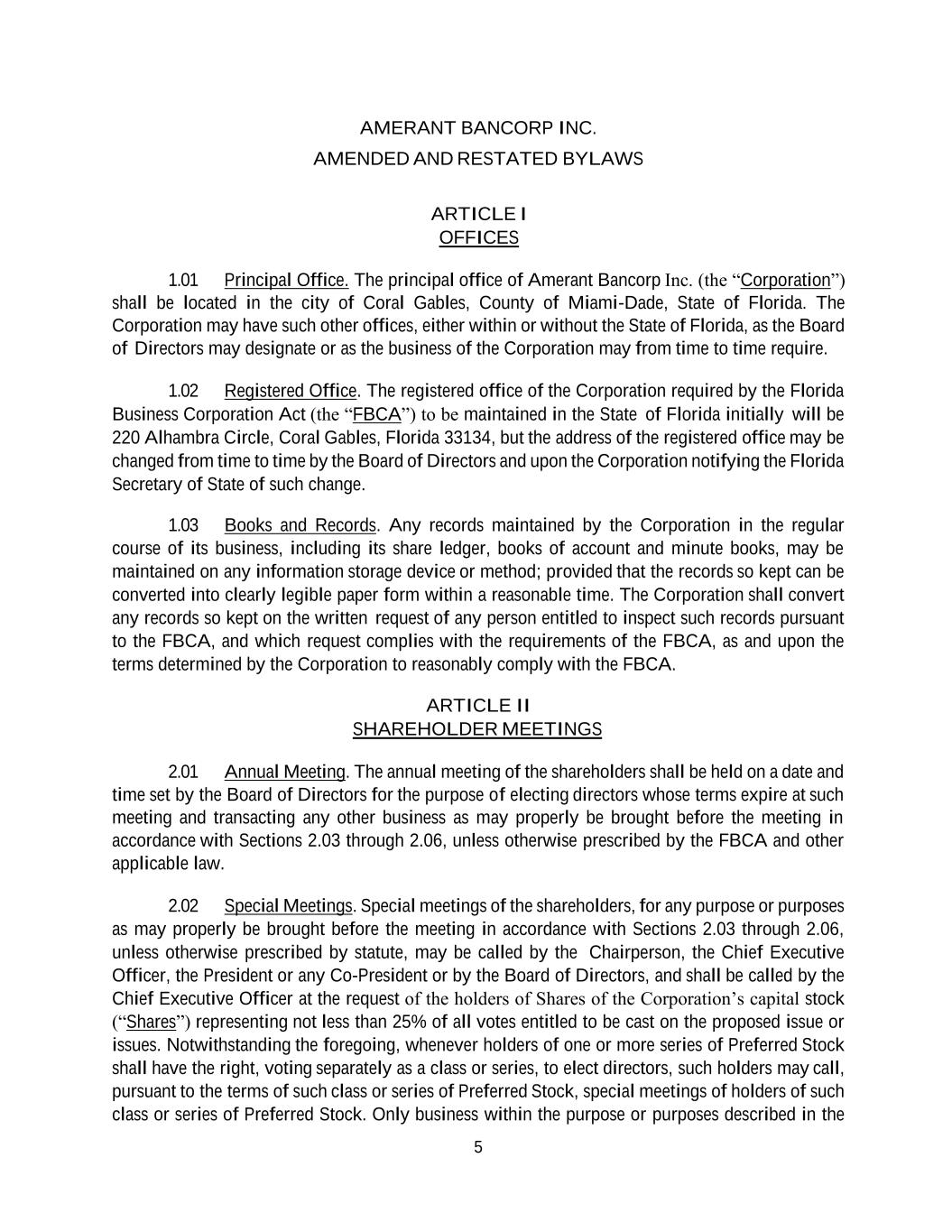 5 AMERANT BANCORP INC. AMENDED AND RESTATED BYLAWS ARTICLE I OFFICES 1.01 Principal Office. The principal office of Amerant Bancorp Inc. (the “Corporation”) shall be located in the city of Coral Gables, County of Miami-Dade, State of Florida. The Corporation may have such other offices, either within or without the State of Florida, as the Board of Directors may designate or as the business of the Corporation may from time to time require. 1.02 Registered Office. The registered office of the Corporation required by the Florida Business Corporation Act (the “FBCA”) to be maintained in the State of Florida initially will be 220 Alhambra Circle, Coral Gables, Florida 33134, but the address of the registered office may be changed from time to time by the Board of Directors and upon the Corporation notifying the Florida Secretary of State of such change. 1.03 Books and Records. Any records maintained by the Corporation in the regular course of its business, including its share ledger, books of account and minute books, may be maintained on any information storage device or method; provided that the records so kept can be converted into clearly legible paper form within a reasonable time. The Corporation shall convert any records so kept on the written request of any person entitled to inspect such records pursuant to the FBCA, and which request complies with the requirements of the FBCA, as and upon the terms determined by the Corporation to reasonably comply with the FBCA. ARTICLE II SHAREHOLDER MEETINGS 2.01 Annual Meeting. The annual meeting of the shareholders shall be held on a date and time set by the Board of Directors for the purpose of electing directors whose terms expire at such meeting and transacting any other business as may properly be brought before the meeting in accordance with Sections 2.03 through 2.06, unless otherwise prescribed by the FBCA and other applicable law. 2.02 Special Meetings. Special meetings of the shareholders, for any purpose or purposes as may properly be brought before the meeting in accordance with Sections 2.03 through 2.06, unless otherwise prescribed by statute, may be called by the Chairperson, the Chief Executive Officer, the President or any Co-President or by the Board of Directors, and shall be called by the Chief Executive Officer at the request of the holders of Shares of the Corporation’s capital stock (“Shares”) representing not less than 25% of all votes entitled to be cast on the proposed issue or issues. Notwithstanding the foregoing, whenever holders of one or more series of Preferred Stock shall have the right, voting separately as a class or series, to elect directors, such holders may call, pursuant to the terms of such class or series of Preferred Stock, special meetings of holders of such class or series of Preferred Stock. Only business within the purpose or purposes described in the
