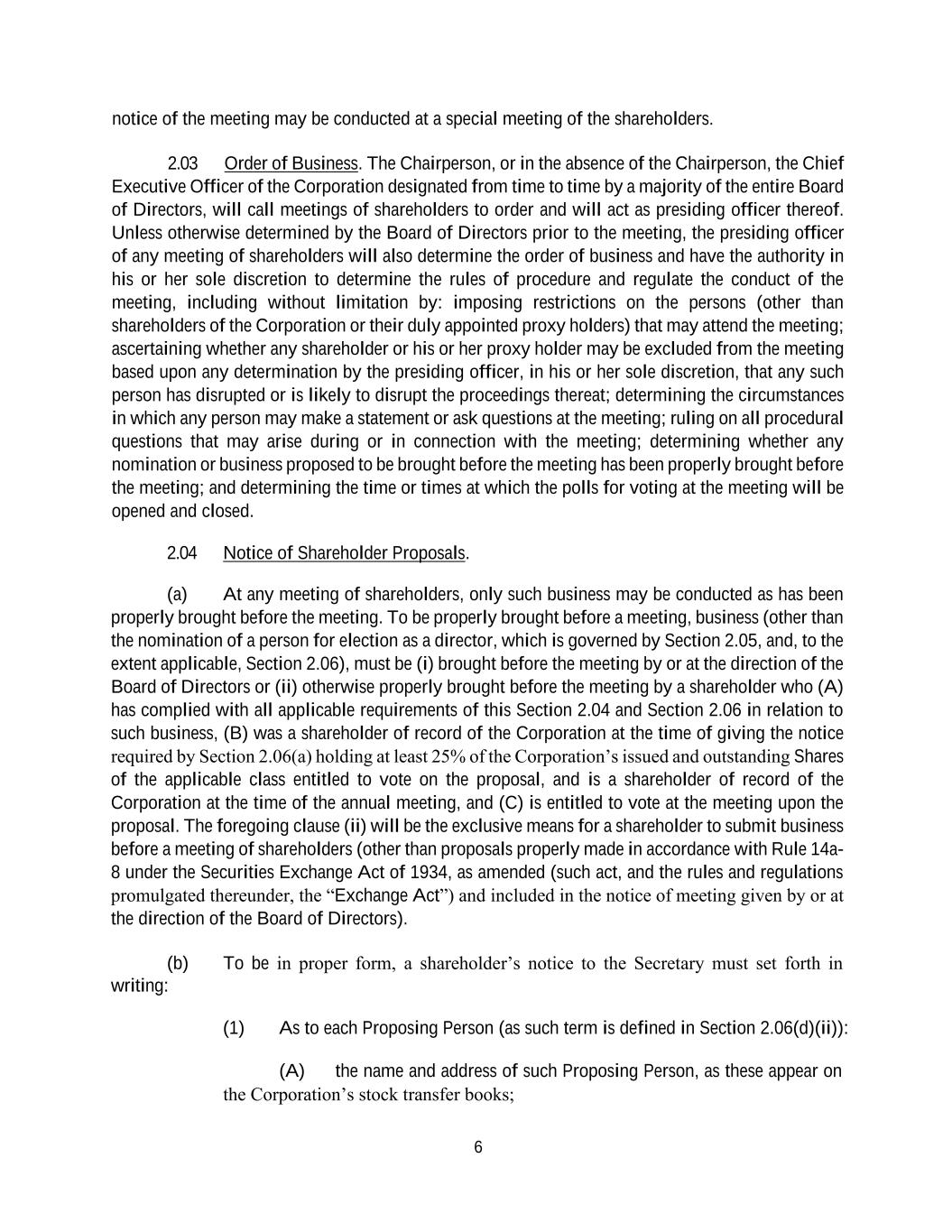 6 notice of the meeting may be conducted at a special meeting of the shareholders. 2.03 Order of Business. The Chairperson, or in the absence of the Chairperson, the Chief Executive Officer of the Corporation designated from time to time by a majority of the entire Board of Directors, will call meetings of shareholders to order and will act as presiding officer thereof. Unless otherwise determined by the Board of Directors prior to the meeting, the presiding officer of any meeting of shareholders will also determine the order of business and have the authority in his or her sole discretion to determine the rules of procedure and regulate the conduct of the meeting, including without limitation by: imposing restrictions on the persons (other than shareholders of the Corporation or their duly appointed proxy holders) that may attend the meeting; ascertaining whether any shareholder or his or her proxy holder may be excluded from the meeting based upon any determination by the presiding officer, in his or her sole discretion, that any such person has disrupted or is likely to disrupt the proceedings thereat; determining the circumstances in which any person may make a statement or ask questions at the meeting; ruling on all procedural questions that may arise during or in connection with the meeting; determining whether any nomination or business proposed to be brought before the meeting has been properly brought before the meeting; and determining the time or times at which the polls for voting at the meeting will be opened and closed. 2.04 Notice of Shareholder Proposals. (a) At any meeting of shareholders, only such business may be conducted as has been properly brought before the meeting. To be properly brought before a meeting, business (other than the nomination of a person for election as a director, which is governed by Section 2.05, and, to the extent applicable, Section 2.06), must be (i) brought before the meeting by or at the direction of the Board of Directors or (ii) otherwise properly brought before the meeting by a shareholder who (A) has complied with all applicable requirements of this Section 2.04 and Section 2.06 in relation to such business, (B) was a shareholder of record of the Corporation at the time of giving the notice required by Section 2.06(a) holding at least 25% of the Corporation’s issued and outstanding Shares of the applicable class entitled to vote on the proposal, and is a shareholder of record of the Corporation at the time of the annual meeting, and (C) is entitled to vote at the meeting upon the proposal. The foregoing clause (ii) will be the exclusive means for a shareholder to submit business before a meeting of shareholders (other than proposals properly made in accordance with Rule 14a- 8 under the Securities Exchange Act of 1934, as amended (such act, and the rules and regulations promulgated thereunder, the “Exchange Act”) and included in the notice of meeting given by or at the direction of the Board of Directors). (b) To be in proper form, a shareholder’s notice to the Secretary must set forth in writing: (1) As to each Proposing Person (as such term is defined in Section 2.06(d)(ii)): (A) the name and address of such Proposing Person, as these appear on the Corporation’s stock transfer books;