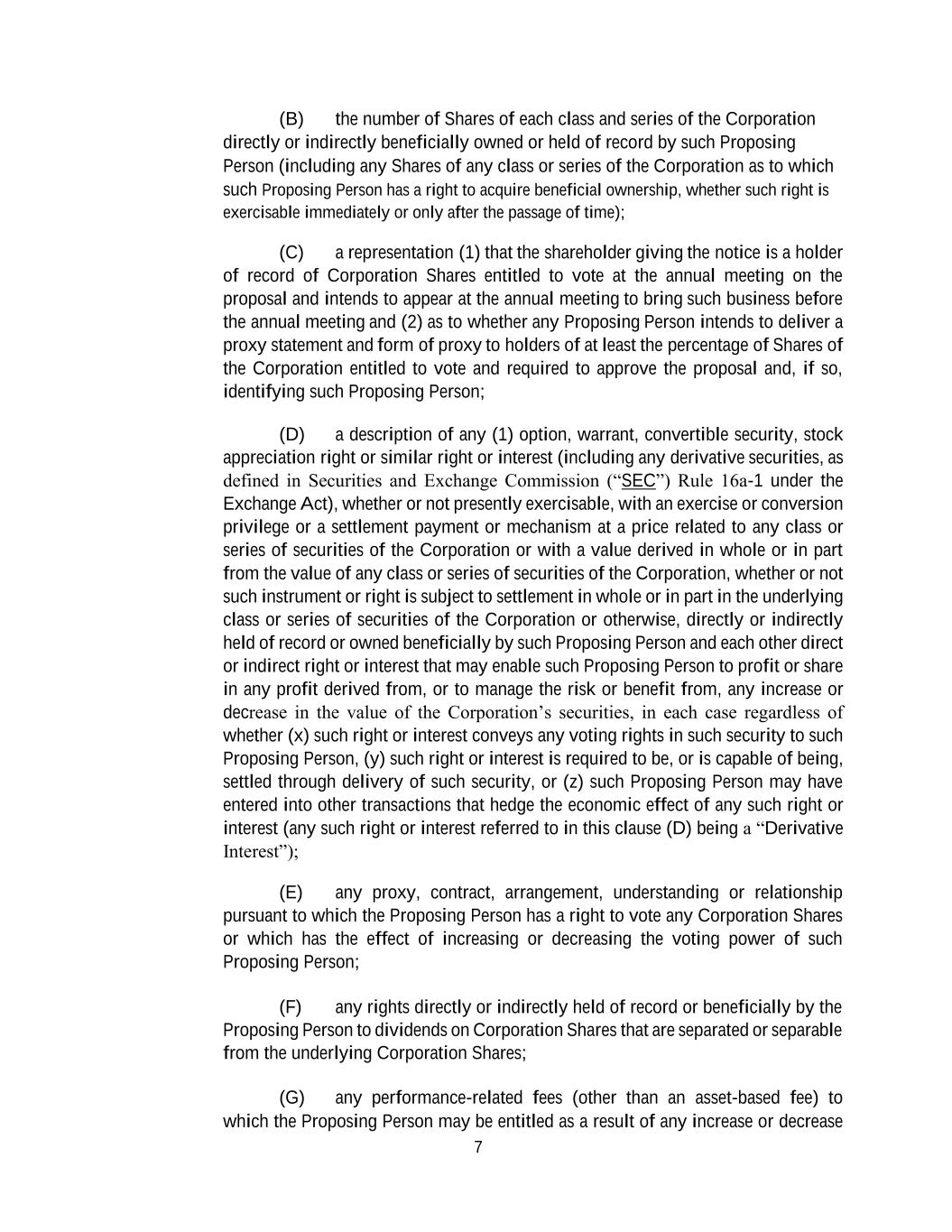 7 (B) the number of Shares of each class and series of the Corporation directly or indirectly beneficially owned or held of record by such Proposing Person (including any Shares of any class or series of the Corporation as to which such Proposing Person has a right to acquire beneficial ownership, whether such right is exercisable immediately or only after the passage of time); (C) a representation (1) that the shareholder giving the notice is a holder of record of Corporation Shares entitled to vote at the annual meeting on the proposal and intends to appear at the annual meeting to bring such business before the annual meeting and (2) as to whether any Proposing Person intends to deliver a proxy statement and form of proxy to holders of at least the percentage of Shares of the Corporation entitled to vote and required to approve the proposal and, if so, identifying such Proposing Person; (D) a description of any (1) option, warrant, convertible security, stock appreciation right or similar right or interest (including any derivative securities, as defined in Securities and Exchange Commission (“SEC”) Rule 16a-1 under the Exchange Act), whether or not presently exercisable, with an exercise or conversion privilege or a settlement payment or mechanism at a price related to any class or series of securities of the Corporation or with a value derived in whole or in part from the value of any class or series of securities of the Corporation, whether or not such instrument or right is subject to settlement in whole or in part in the underlying class or series of securities of the Corporation or otherwise, directly or indirectly held of record or owned beneficially by such Proposing Person and each other direct or indirect right or interest that may enable such Proposing Person to profit or share in any profit derived from, or to manage the risk or benefit from, any increase or decrease in the value of the Corporation’s securities, in each case regardless of whether (x) such right or interest conveys any voting rights in such security to such Proposing Person, (y) such right or interest is required to be, or is capable of being, settled through delivery of such security, or (z) such Proposing Person may have entered into other transactions that hedge the economic effect of any such right or interest (any such right or interest referred to in this clause (D) being a “Derivative Interest”); (E) any proxy, contract, arrangement, understanding or relationship pursuant to which the Proposing Person has a right to vote any Corporation Shares or which has the effect of increasing or decreasing the voting power of such Proposing Person; (F) any rights directly or indirectly held of record or beneficially by the Proposing Person to dividends on Corporation Shares that are separated or separable from the underlying Corporation Shares; (G) any performance-related fees (other than an asset-based fee) to which the Proposing Person may be entitled as a result of any increase or decrease