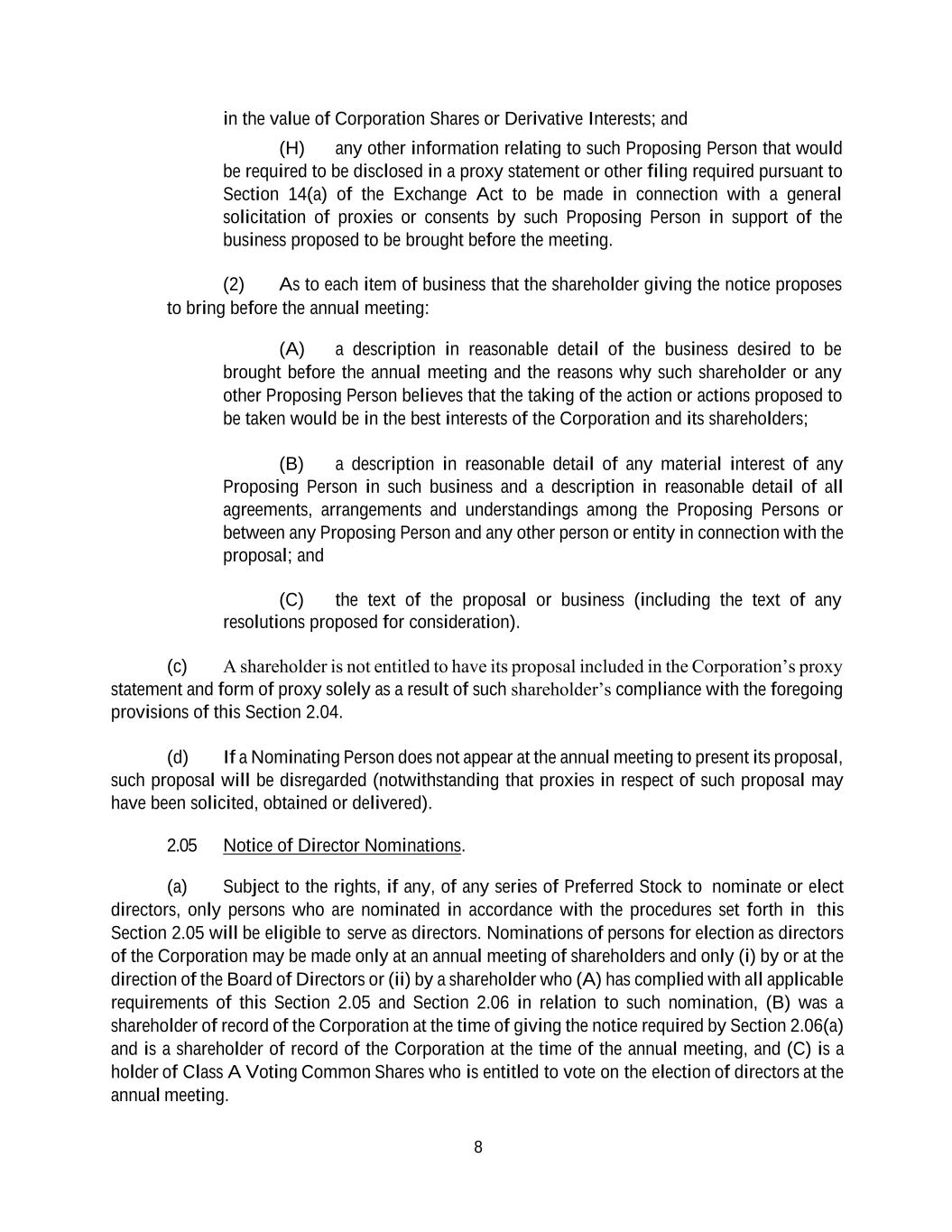 8 in the value of Corporation Shares or Derivative Interests; and (H) any other information relating to such Proposing Person that would be required to be disclosed in a proxy statement or other filing required pursuant to Section 14(a) of the Exchange Act to be made in connection with a general solicitation of proxies or consents by such Proposing Person in support of the business proposed to be brought before the meeting. (2) As to each item of business that the shareholder giving the notice proposes to bring before the annual meeting: (A) a description in reasonable detail of the business desired to be brought before the annual meeting and the reasons why such shareholder or any other Proposing Person believes that the taking of the action or actions proposed to be taken would be in the best interests of the Corporation and its shareholders; (B) a description in reasonable detail of any material interest of any Proposing Person in such business and a description in reasonable detail of all agreements, arrangements and understandings among the Proposing Persons or between any Proposing Person and any other person or entity in connection with the proposal; and (C) the text of the proposal or business (including the text of any resolutions proposed for consideration). (c) A shareholder is not entitled to have its proposal included in the Corporation’s proxy statement and form of proxy solely as a result of such shareholder’s compliance with the foregoing provisions of this Section 2.04. (d) If a Nominating Person does not appear at the annual meeting to present its proposal, such proposal will be disregarded (notwithstanding that proxies in respect of such proposal may have been solicited, obtained or delivered). 2.05 Notice of Director Nominations. (a) Subject to the rights, if any, of any series of Preferred Stock to nominate or elect directors, only persons who are nominated in accordance with the procedures set forth in this Section 2.05 will be eligible to serve as directors. Nominations of persons for election as directors of the Corporation may be made only at an annual meeting of shareholders and only (i) by or at the direction of the Board of Directors or (ii) by a shareholder who (A) has complied with all applicable requirements of this Section 2.05 and Section 2.06 in relation to such nomination, (B) was a shareholder of record of the Corporation at the time of giving the notice required by Section 2.06(a) and is a shareholder of record of the Corporation at the time of the annual meeting, and (C) is a holder of Class A Voting Common Shares who is entitled to vote on the election of directors at the annual meeting.