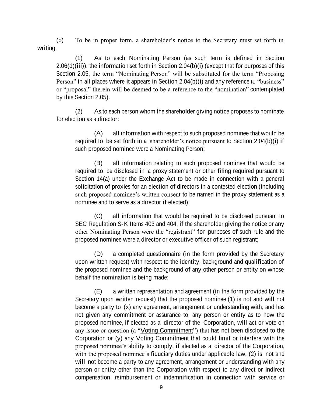 9 (b) To be in proper form, a shareholder’s notice to the Secretary must set forth in writing: (1) As to each Nominating Person (as such term is defined in Section 2.06(d)(iii)), the information set forth in Section 2.04(b)(i) (except that for purposes of this Section 2.05, the term “Nominating Person” will be substituted for the term “Proposing Person” in all places where it appears in Section 2.04(b)(i) and any reference to “business” or “proposal” therein will be deemed to be a reference to the “nomination” contemplated by this Section 2.05). (2) As to each person whom the shareholder giving notice proposes to nominate for election as a director: (A) all information with respect to such proposed nominee that would be required to be set forth in a shareholder’s notice pursuant to Section 2.04(b)(i) if such proposed nominee were a Nominating Person; (B) all information relating to such proposed nominee that would be required to be disclosed in a proxy statement or other filing required pursuant to Section 14(a) under the Exchange Act to be made in connection with a general solicitation of proxies for an election of directors in a contested election (including such proposed nominee’s written consent to be named in the proxy statement as a nominee and to serve as a director if elected); (C) all information that would be required to be disclosed pursuant to SEC Regulation S-K Items 403 and 404, if the shareholder giving the notice or any other Nominating Person were the “registrant” for purposes of such rule and the proposed nominee were a director or executive officer of such registrant; (D) a completed questionnaire (in the form provided by the Secretary upon written request) with respect to the identity, background and qualification of the proposed nominee and the background of any other person or entity on whose behalf the nomination is being made; (E) a written representation and agreement (in the form provided by the Secretary upon written request) that the proposed nominee (1) is not and will not become a party to (x) any agreement, arrangement or understanding with, and has not given any commitment or assurance to, any person or entity as to how the proposed nominee, if elected as a director of the Corporation, will act or vote on any issue or question (a “Voting Commitment”) that has not been disclosed to the Corporation or (y) any Voting Commitment that could limit or interfere with the proposed nominee’s ability to comply, if elected as a director of the Corporation, with the proposed nominee’s fiduciary duties under applicable law, (2) is not and will not become a party to any agreement, arrangement or understanding with any person or entity other than the Corporation with respect to any direct or indirect compensation, reimbursement or indemnification in connection with service or