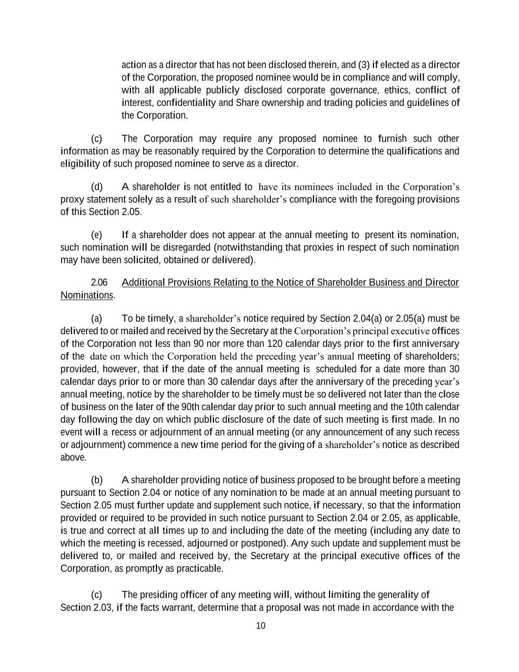 10 action as a director that has not been disclosed therein, and (3) if elected as a director of the Corporation, the proposed nominee would be in compliance and will comply, with all applicable publicly disclosed corporate governance, ethics, conflict of interest, confidentiality and Share ownership and trading policies and guidelines of the Corporation. (c) The Corporation may require any proposed nominee to furnish such other information as may be reasonably required by the Corporation to determine the qualifications and eligibility of such proposed nominee to serve as a director. (d) A shareholder is not entitled to have its nominees included in the Corporation’s proxy statement solely as a result of such shareholder’s compliance with the foregoing provisions of this Section 2.05. (e) If a shareholder does not appear at the annual meeting to present its nomination, such nomination will be disregarded (notwithstanding that proxies in respect of such nomination may have been solicited, obtained or delivered). 2.06 Additional Provisions Relating to the Notice of Shareholder Business and Director Nominations. (a) To be timely, a shareholder’s notice required by Section 2.04(a) or 2.05(a) must be delivered to or mailed and received by the Secretary at the Corporation’s principal executive offices of the Corporation not less than 90 nor more than 120 calendar days prior to the first anniversary of the date on which the Corporation held the preceding year’s annual meeting of shareholders; provided, however, that if the date of the annual meeting is scheduled for a date more than 30 calendar days prior to or more than 30 calendar days after the anniversary of the preceding year’s annual meeting, notice by the shareholder to be timely must be so delivered not later than the close of business on the later of the 90th calendar day prior to such annual meeting and the 10th calendar day following the day on which public disclosure of the date of such meeting is first made. In no event will a recess or adjournment of an annual meeting (or any announcement of any such recess or adjournment) commence a new time period for the giving of a shareholder’s notice as described above. (b) A shareholder providing notice of business proposed to be brought before a meeting pursuant to Section 2.04 or notice of any nomination to be made at an annual meeting pursuant to Section 2.05 must further update and supplement such notice, if necessary, so that the information provided or required to be provided in such notice pursuant to Section 2.04 or 2.05, as applicable, is true and correct at all times up to and including the date of the meeting (including any date to which the meeting is recessed, adjourned or postponed). Any such update and supplement must be delivered to, or mailed and received by, the Secretary at the principal executive offices of the Corporation, as promptly as practicable. (c) The presiding officer of any meeting will, without limiting the generality of Section 2.03, if the facts warrant, determine that a proposal was not made in accordance with the