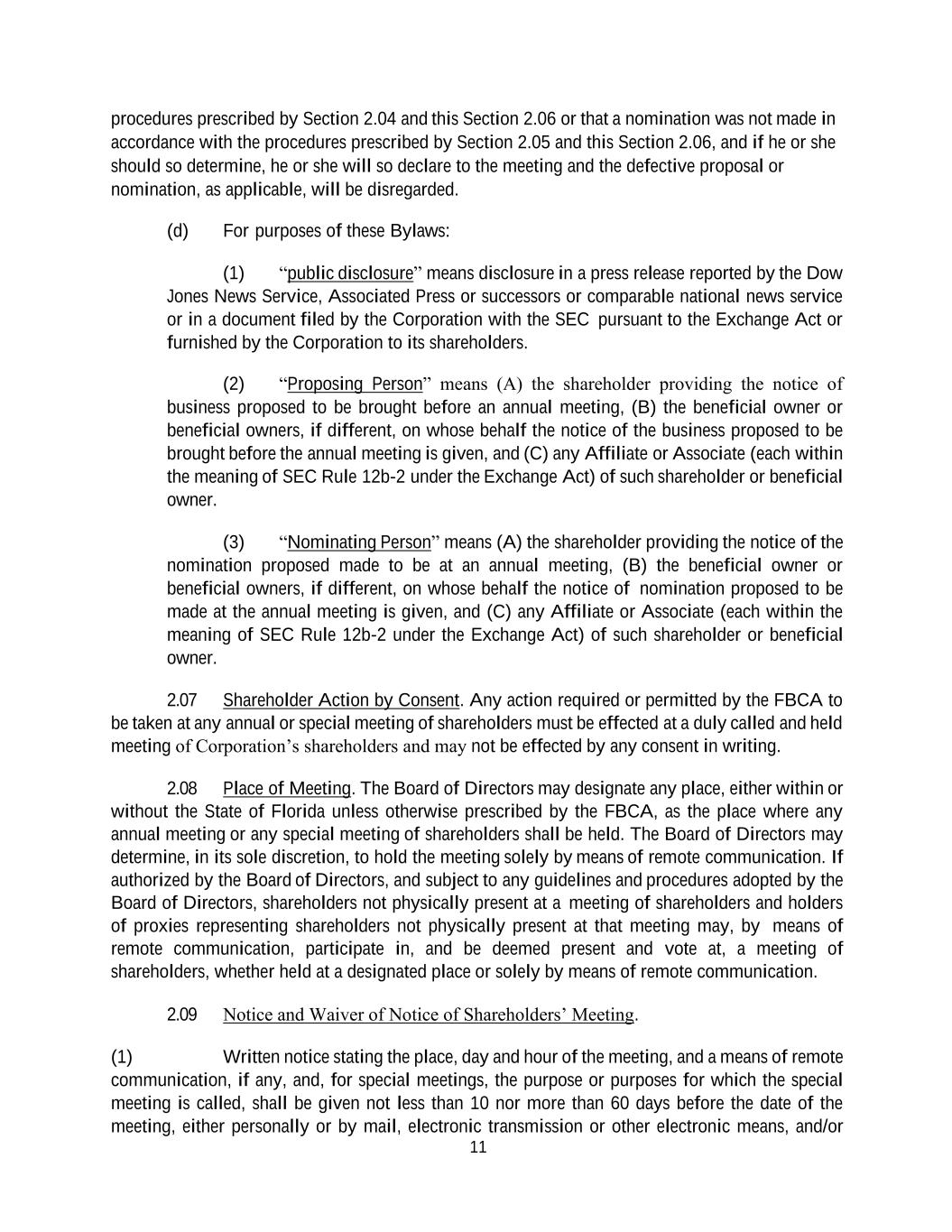 11 procedures prescribed by Section 2.04 and this Section 2.06 or that a nomination was not made in accordance with the procedures prescribed by Section 2.05 and this Section 2.06, and if he or she should so determine, he or she will so declare to the meeting and the defective proposal or nomination, as applicable, will be disregarded. (d) For purposes of these Bylaws: (1) “public disclosure” means disclosure in a press release reported by the Dow Jones News Service, Associated Press or successors or comparable national news service or in a document filed by the Corporation with the SEC pursuant to the Exchange Act or furnished by the Corporation to its shareholders. (2) “Proposing Person” means (A) the shareholder providing the notice of business proposed to be brought before an annual meeting, (B) the beneficial owner or beneficial owners, if different, on whose behalf the notice of the business proposed to be brought before the annual meeting is given, and (C) any Affiliate or Associate (each within the meaning of SEC Rule 12b-2 under the Exchange Act) of such shareholder or beneficial owner. (3) “Nominating Person” means (A) the shareholder providing the notice of the nomination proposed made to be at an annual meeting, (B) the beneficial owner or beneficial owners, if different, on whose behalf the notice of nomination proposed to be made at the annual meeting is given, and (C) any Affiliate or Associate (each within the meaning of SEC Rule 12b-2 under the Exchange Act) of such shareholder or beneficial owner. 2.07 Shareholder Action by Consent. Any action required or permitted by the FBCA to be taken at any annual or special meeting of shareholders must be effected at a duly called and held meeting of Corporation’s shareholders and may not be effected by any consent in writing. 2.08 Place of Meeting. The Board of Directors may designate any place, either within or without the State of Florida unless otherwise prescribed by the FBCA, as the place where any annual meeting or any special meeting of shareholders shall be held. The Board of Directors may determine, in its sole discretion, to hold the meeting solely by means of remote communication. If authorized by the Board of Directors, and subject to any guidelines and procedures adopted by the Board of Directors, shareholders not physically present at a meeting of shareholders and holders of proxies representing shareholders not physically present at that meeting may, by means of remote communication, participate in, and be deemed present and vote at, a meeting of shareholders, whether held at a designated place or solely by means of remote communication. 2.09 Notice and Waiver of Notice of Shareholders’ Meeting. (1) Written notice stating the place, day and hour of the meeting, and a means of remote communication, if any, and, for special meetings, the purpose or purposes for which the special meeting is called, shall be given not less than 10 nor more than 60 days before the date of the meeting, either personally or by mail, electronic transmission or other electronic means, and/or