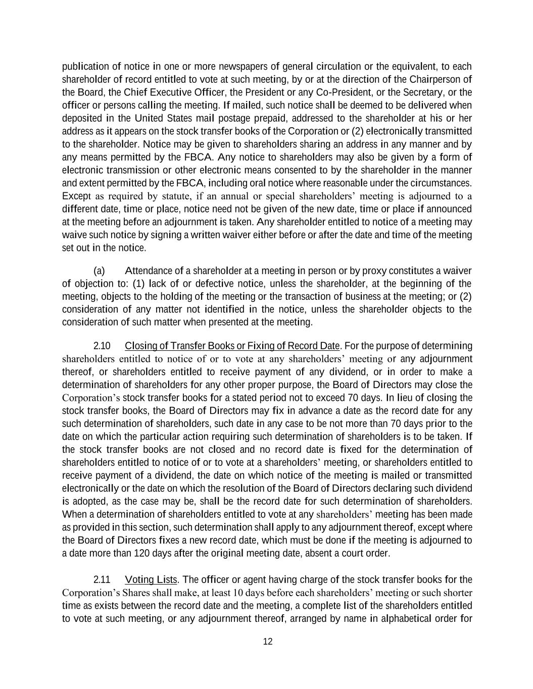 12 publication of notice in one or more newspapers of general circulation or the equivalent, to each shareholder of record entitled to vote at such meeting, by or at the direction of the Chairperson of the Board, the Chief Executive Officer, the President or any Co-President, or the Secretary, or the officer or persons calling the meeting. If mailed, such notice shall be deemed to be delivered when deposited in the United States mail postage prepaid, addressed to the shareholder at his or her address as it appears on the stock transfer books of the Corporation or (2) electronically transmitted to the shareholder. Notice may be given to shareholders sharing an address in any manner and by any means permitted by the FBCA. Any notice to shareholders may also be given by a form of electronic transmission or other electronic means consented to by the shareholder in the manner and extent permitted by the FBCA, including oral notice where reasonable under the circumstances. Except as required by statute, if an annual or special shareholders’ meeting is adjourned to a different date, time or place, notice need not be given of the new date, time or place if announced at the meeting before an adjournment is taken. Any shareholder entitled to notice of a meeting may waive such notice by signing a written waiver either before or after the date and time of the meeting set out in the notice. (a) Attendance of a shareholder at a meeting in person or by proxy constitutes a waiver of objection to: (1) lack of or defective notice, unless the shareholder, at the beginning of the meeting, objects to the holding of the meeting or the transaction of business at the meeting; or (2) consideration of any matter not identified in the notice, unless the shareholder objects to the consideration of such matter when presented at the meeting. 2.10 Closing of Transfer Books or Fixing of Record Date. For the purpose of determining shareholders entitled to notice of or to vote at any shareholders’ meeting or any adjournment thereof, or shareholders entitled to receive payment of any dividend, or in order to make a determination of shareholders for any other proper purpose, the Board of Directors may close the Corporation’s stock transfer books for a stated period not to exceed 70 days. In lieu of closing the stock transfer books, the Board of Directors may fix in advance a date as the record date for any such determination of shareholders, such date in any case to be not more than 70 days prior to the date on which the particular action requiring such determination of shareholders is to be taken. If the stock transfer books are not closed and no record date is fixed for the determination of shareholders entitled to notice of or to vote at a shareholders’ meeting, or shareholders entitled to receive payment of a dividend, the date on which notice of the meeting is mailed or transmitted electronically or the date on which the resolution of the Board of Directors declaring such dividend is adopted, as the case may be, shall be the record date for such determination of shareholders. When a determination of shareholders entitled to vote at any shareholders’ meeting has been made as provided in this section, such determination shall apply to any adjournment thereof, except where the Board of Directors fixes a new record date, which must be done if the meeting is adjourned to a date more than 120 days after the original meeting date, absent a court order. 2.11 Voting Lists. The officer or agent having charge of the stock transfer books for the Corporation’s Shares shall make, at least 10 days before each shareholders’ meeting or such shorter time as exists between the record date and the meeting, a complete list of the shareholders entitled to vote at such meeting, or any adjournment thereof, arranged by name in alphabetical order for