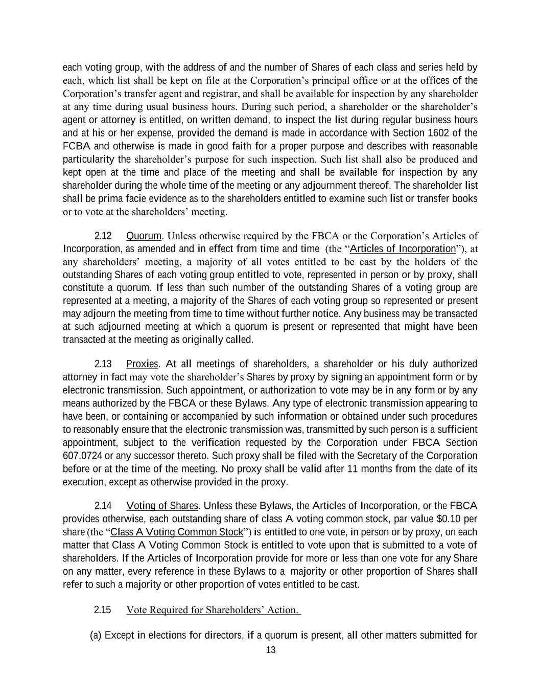 13 each voting group, with the address of and the number of Shares of each class and series held by each, which list shall be kept on file at the Corporation’s principal office or at the offices of the Corporation’s transfer agent and registrar, and shall be available for inspection by any shareholder at any time during usual business hours. During such period, a shareholder or the shareholder’s agent or attorney is entitled, on written demand, to inspect the list during regular business hours and at his or her expense, provided the demand is made in accordance with Section 1602 of the FCBA and otherwise is made in good faith for a proper purpose and describes with reasonable particularity the shareholder’s purpose for such inspection. Such list shall also be produced and kept open at the time and place of the meeting and shall be available for inspection by any shareholder during the whole time of the meeting or any adjournment thereof. The shareholder list shall be prima facie evidence as to the shareholders entitled to examine such list or transfer books or to vote at the shareholders’ meeting. 2.12 Quorum. Unless otherwise required by the FBCA or the Corporation’s Articles of Incorporation, as amended and in effect from time and time (the “Articles of Incorporation”), at any shareholders’ meeting, a majority of all votes entitled to be cast by the holders of the outstanding Shares of each voting group entitled to vote, represented in person or by proxy, shall constitute a quorum. If less than such number of the outstanding Shares of a voting group are represented at a meeting, a majority of the Shares of each voting group so represented or present may adjourn the meeting from time to time without further notice. Any business may be transacted at such adjourned meeting at which a quorum is present or represented that might have been transacted at the meeting as originally called. 2.13 Proxies. At all meetings of shareholders, a shareholder or his duly authorized attorney in fact may vote the shareholder’s Shares by proxy by signing an appointment form or by electronic transmission. Such appointment, or authorization to vote may be in any form or by any means authorized by the FBCA or these Bylaws. Any type of electronic transmission appearing to have been, or containing or accompanied by such information or obtained under such procedures to reasonably ensure that the electronic transmission was, transmitted by such person is a sufficient appointment, subject to the verification requested by the Corporation under FBCA Section 607.0724 or any successor thereto. Such proxy shall be filed with the Secretary of the Corporation before or at the time of the meeting. No proxy shall be valid after 11 months from the date of its execution, except as otherwise provided in the proxy. 2.14 Voting of Shares. Unless these Bylaws, the Articles of Incorporation, or the FBCA provides otherwise, each outstanding share of class A voting common stock, par value $0.10 per share (the “Class A Voting Common Stock”) is entitled to one vote, in person or by proxy, on each matter that Class A Voting Common Stock is entitled to vote upon that is submitted to a vote of shareholders. If the Articles of Incorporation provide for more or less than one vote for any Share on any matter, every reference in these Bylaws to a majority or other proportion of Shares shall refer to such a majority or other proportion of votes entitled to be cast. 2.15 Vote Required for Shareholders’ Action. (a) Except in elections for directors, if a quorum is present, all other matters submitted for