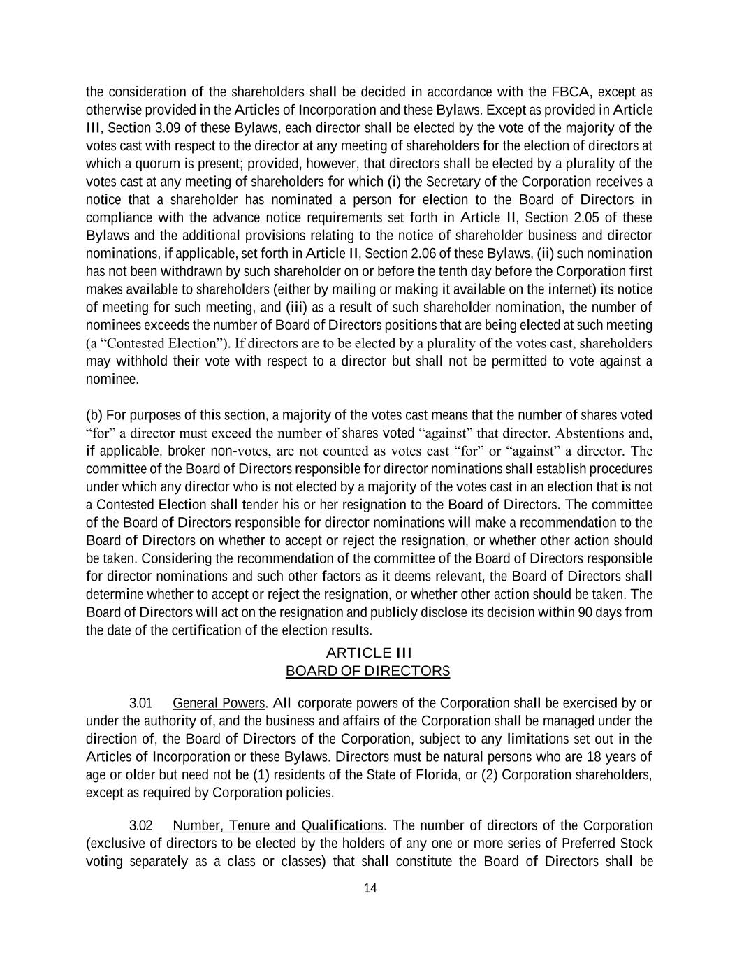 14 the consideration of the shareholders shall be decided in accordance with the FBCA, except as otherwise provided in the Articles of Incorporation and these Bylaws. Except as provided in Article III, Section 3.09 of these Bylaws, each director shall be elected by the vote of the majority of the votes cast with respect to the director at any meeting of shareholders for the election of directors at which a quorum is present; provided, however, that directors shall be elected by a plurality of the votes cast at any meeting of shareholders for which (i) the Secretary of the Corporation receives a notice that a shareholder has nominated a person for election to the Board of Directors in compliance with the advance notice requirements set forth in Article II, Section 2.05 of these Bylaws and the additional provisions relating to the notice of shareholder business and director nominations, if applicable, set forth in Article II, Section 2.06 of these Bylaws, (ii) such nomination has not been withdrawn by such shareholder on or before the tenth day before the Corporation first makes available to shareholders (either by mailing or making it available on the internet) its notice of meeting for such meeting, and (iii) as a result of such shareholder nomination, the number of nominees exceeds the number of Board of Directors positions that are being elected at such meeting (a “Contested Election”). If directors are to be elected by a plurality of the votes cast, shareholders may withhold their vote with respect to a director but shall not be permitted to vote against a nominee. (b) For purposes of this section, a majority of the votes cast means that the number of shares voted “for” a director must exceed the number of shares voted “against” that director. Abstentions and, if applicable, broker non-votes, are not counted as votes cast “for” or “against” a director. The committee of the Board of Directors responsible for director nominations shall establish procedures under which any director who is not elected by a majority of the votes cast in an election that is not a Contested Election shall tender his or her resignation to the Board of Directors. The committee of the Board of Directors responsible for director nominations will make a recommendation to the Board of Directors on whether to accept or reject the resignation, or whether other action should be taken. Considering the recommendation of the committee of the Board of Directors responsible for director nominations and such other factors as it deems relevant, the Board of Directors shall determine whether to accept or reject the resignation, or whether other action should be taken. The Board of Directors will act on the resignation and publicly disclose its decision within 90 days from the date of the certification of the election results. ARTICLE III BOARD OF DIRECTORS 3.01 General Powers. All corporate powers of the Corporation shall be exercised by or under the authority of, and the business and affairs of the Corporation shall be managed under the direction of, the Board of Directors of the Corporation, subject to any limitations set out in the Articles of Incorporation or these Bylaws. Directors must be natural persons who are 18 years of age or older but need not be (1) residents of the State of Florida, or (2) Corporation shareholders, except as required by Corporation policies. 3.02 Number, Tenure and Qualifications. The number of directors of the Corporation (exclusive of directors to be elected by the holders of any one or more series of Preferred Stock voting separately as a class or classes) that shall constitute the Board of Directors shall be