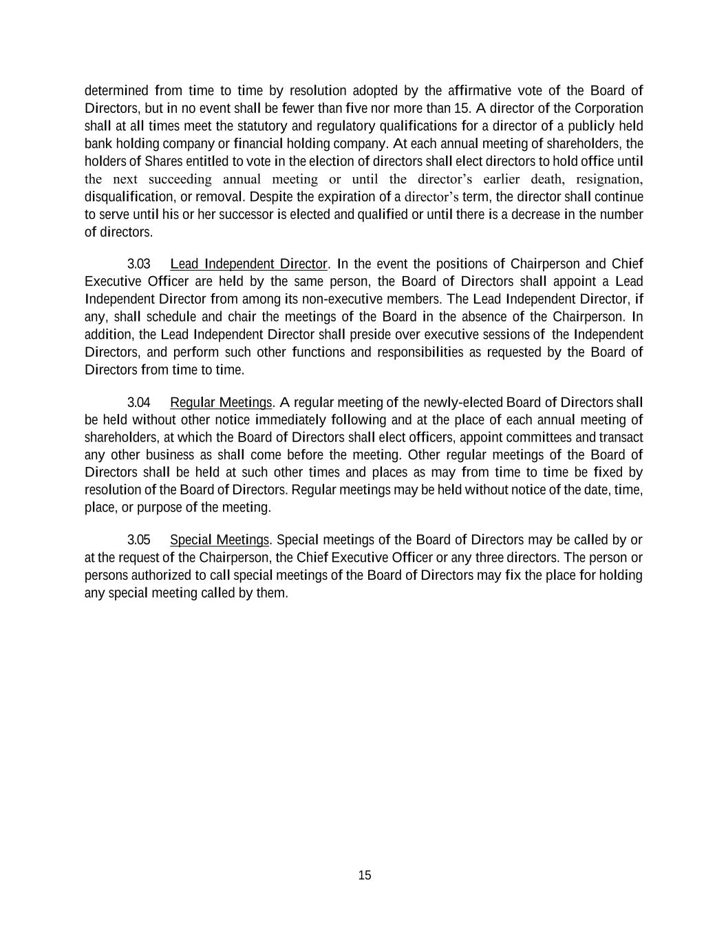 15 determined from time to time by resolution adopted by the affirmative vote of the Board of Directors, but in no event shall be fewer than five nor more than 15. A director of the Corporation shall at all times meet the statutory and regulatory qualifications for a director of a publicly held bank holding company or financial holding company. At each annual meeting of shareholders, the holders of Shares entitled to vote in the election of directors shall elect directors to hold office until the next succeeding annual meeting or until the director’s earlier death, resignation, disqualification, or removal. Despite the expiration of a director’s term, the director shall continue to serve until his or her successor is elected and qualified or until there is a decrease in the number of directors. 3.03 Lead Independent Director. In the event the positions of Chairperson and Chief Executive Officer are held by the same person, the Board of Directors shall appoint a Lead Independent Director from among its non-executive members. The Lead Independent Director, if any, shall schedule and chair the meetings of the Board in the absence of the Chairperson. In addition, the Lead Independent Director shall preside over executive sessions of the Independent Directors, and perform such other functions and responsibilities as requested by the Board of Directors from time to time. 3.04 Regular Meetings. A regular meeting of the newly-elected Board of Directors shall be held without other notice immediately following and at the place of each annual meeting of shareholders, at which the Board of Directors shall elect officers, appoint committees and transact any other business as shall come before the meeting. Other regular meetings of the Board of Directors shall be held at such other times and places as may from time to time be fixed by resolution of the Board of Directors. Regular meetings may be held without notice of the date, time, place, or purpose of the meeting. 3.05 Special Meetings. Special meetings of the Board of Directors may be called by or at the request of the Chairperson, the Chief Executive Officer or any three directors. The person or persons authorized to call special meetings of the Board of Directors may fix the place for holding any special meeting called by them.