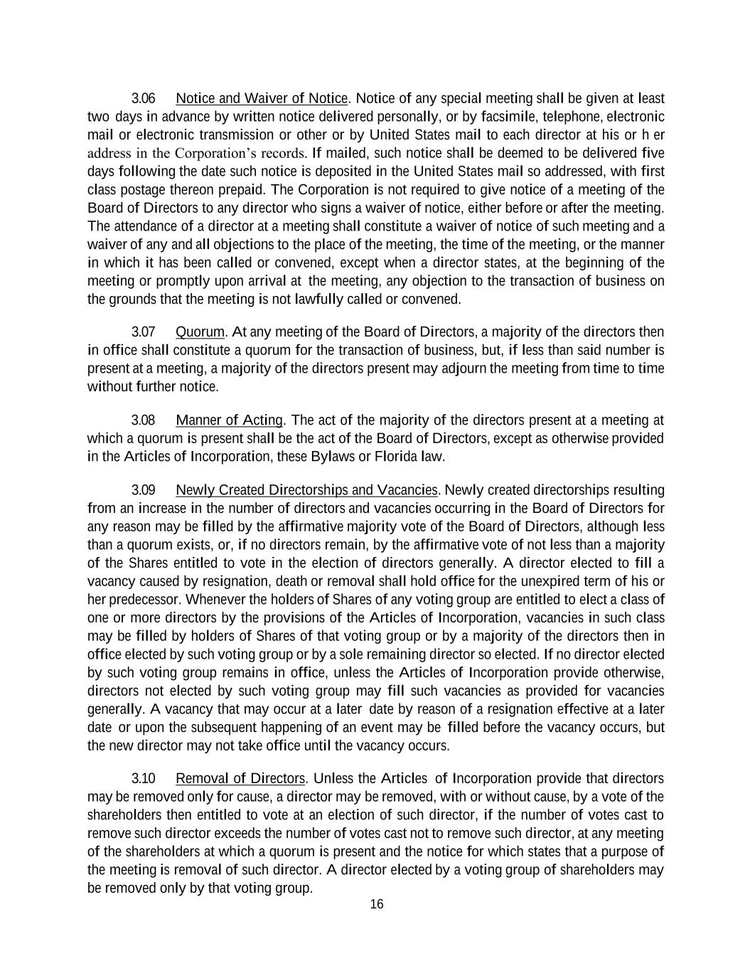 16 3.06 Notice and Waiver of Notice. Notice of any special meeting shall be given at least two days in advance by written notice delivered personally, or by facsimile, telephone, electronic mail or electronic transmission or other or by United States mail to each director at his or h er address in the Corporation’s records. If mailed, such notice shall be deemed to be delivered five days following the date such notice is deposited in the United States mail so addressed, with first class postage thereon prepaid. The Corporation is not required to give notice of a meeting of the Board of Directors to any director who signs a waiver of notice, either before or after the meeting. The attendance of a director at a meeting shall constitute a waiver of notice of such meeting and a waiver of any and all objections to the place of the meeting, the time of the meeting, or the manner in which it has been called or convened, except when a director states, at the beginning of the meeting or promptly upon arrival at the meeting, any objection to the transaction of business on the grounds that the meeting is not lawfully called or convened. 3.07 Quorum. At any meeting of the Board of Directors, a majority of the directors then in office shall constitute a quorum for the transaction of business, but, if less than said number is present at a meeting, a majority of the directors present may adjourn the meeting from time to time without further notice. 3.08 Manner of Acting. The act of the majority of the directors present at a meeting at which a quorum is present shall be the act of the Board of Directors, except as otherwise provided in the Articles of Incorporation, these Bylaws or Florida law. 3.09 Newly Created Directorships and Vacancies. Newly created directorships resulting from an increase in the number of directors and vacancies occurring in the Board of Directors for any reason may be filled by the affirmative majority vote of the Board of Directors, although less than a quorum exists, or, if no directors remain, by the affirmative vote of not less than a majority of the Shares entitled to vote in the election of directors generally. A director elected to fill a vacancy caused by resignation, death or removal shall hold office for the unexpired term of his or her predecessor. Whenever the holders of Shares of any voting group are entitled to elect a class of one or more directors by the provisions of the Articles of Incorporation, vacancies in such class may be filled by holders of Shares of that voting group or by a majority of the directors then in office elected by such voting group or by a sole remaining director so elected. If no director elected by such voting group remains in office, unless the Articles of Incorporation provide otherwise, directors not elected by such voting group may fill such vacancies as provided for vacancies generally. A vacancy that may occur at a later date by reason of a resignation effective at a later date or upon the subsequent happening of an event may be filled before the vacancy occurs, but the new director may not take office until the vacancy occurs. 3.10 Removal of Directors. Unless the Articles of Incorporation provide that directors may be removed only for cause, a director may be removed, with or without cause, by a vote of the shareholders then entitled to vote at an election of such director, if the number of votes cast to remove such director exceeds the number of votes cast not to remove such director, at any meeting of the shareholders at which a quorum is present and the notice for which states that a purpose of the meeting is removal of such director. A director elected by a voting group of shareholders may be removed only by that voting group.