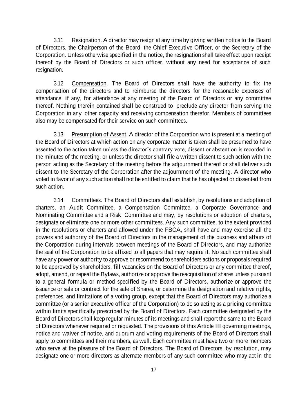 17 3.11 Resignation. A director may resign at any time by giving written notice to the Board of Directors, the Chairperson of the Board, the Chief Executive Officer, or the Secretary of the Corporation. Unless otherwise specified in the notice, the resignation shall take effect upon receipt thereof by the Board of Directors or such officer, without any need for acceptance of such resignation. 3.12 Compensation. The Board of Directors shall have the authority to fix the compensation of the directors and to reimburse the directors for the reasonable expenses of attendance, if any, for attendance at any meeting of the Board of Directors or any committee thereof. Nothing therein contained shall be construed to preclude any director from serving the Corporation in any other capacity and receiving compensation therefor. Members of committees also may be compensated for their service on such committees. 3.13 Presumption of Assent. A director of the Corporation who is present at a meeting of the Board of Directors at which action on any corporate matter is taken shall be presumed to have assented to the action taken unless the director’s contrary vote, dissent or abstention is recorded in the minutes of the meeting, or unless the director shall file a written dissent to such action with the person acting as the Secretary of the meeting before the adjournment thereof or shall deliver such dissent to the Secretary of the Corporation after the adjournment of the meeting. A director who voted in favor of any such action shall not be entitled to claim that he has objected or dissented from such action. 3.14 Committees. The Board of Directors shall establish, by resolutions and adoption of charters, an Audit Committee, a Compensation Committee, a Corporate Governance and Nominating Committee and a Risk Committee and may, by resolutions or adoption of charters, designate or eliminate one or more other committees. Any such committee, to the extent provided in the resolutions or charters and allowed under the FBCA, shall have and may exercise all the powers and authority of the Board of Directors in the management of the business and affairs of the Corporation during intervals between meetings of the Board of Directors, and may authorize the seal of the Corporation to be affixed to all papers that may require it. No such committee shall have any power or authority to approve or recommend to shareholders actions or proposals required to be approved by shareholders, fill vacancies on the Board of Directors or any committee thereof, adopt, amend, or repeal the Bylaws, authorize or approve the reacquisition of shares unless pursuant to a general formula or method specified by the Board of Directors, authorize or approve the issuance or sale or contract for the sale of Shares, or determine the designation and relative rights, preferences, and limitations of a voting group, except that the Board of Directors may authorize a committee (or a senior executive officer of the Corporation) to do so acting as a pricing committee within limits specifically prescribed by the Board of Directors. Each committee designated by the Board of Directors shall keep regular minutes of its meetings and shall report the same to the Board of Directors whenever required or requested. The provisions of this Article III governing meetings, notice and waiver of notice, and quorum and voting requirements of the Board of Directors shall apply to committees and their members, as well. Each committee must have two or more members who serve at the pleasure of the Board of Directors. The Board of Directors, by resolution, may designate one or more directors as alternate members of any such committee who may act in the