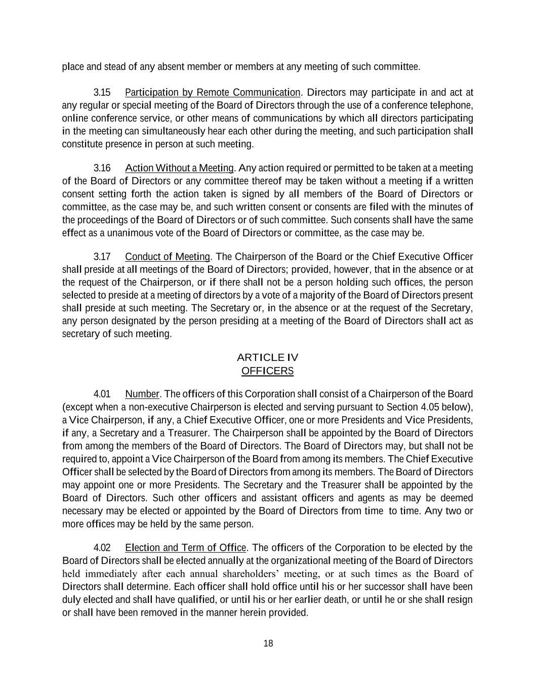 18 place and stead of any absent member or members at any meeting of such committee. 3.15 Participation by Remote Communication. Directors may participate in and act at any regular or special meeting of the Board of Directors through the use of a conference telephone, online conference service, or other means of communications by which all directors participating in the meeting can simultaneously hear each other during the meeting, and such participation shall constitute presence in person at such meeting. 3.16 Action Without a Meeting. Any action required or permitted to be taken at a meeting of the Board of Directors or any committee thereof may be taken without a meeting if a written consent setting forth the action taken is signed by all members of the Board of Directors or committee, as the case may be, and such written consent or consents are filed with the minutes of the proceedings of the Board of Directors or of such committee. Such consents shall have the same effect as a unanimous vote of the Board of Directors or committee, as the case may be. 3.17 Conduct of Meeting. The Chairperson of the Board or the Chief Executive Officer shall preside at all meetings of the Board of Directors; provided, however, that in the absence or at the request of the Chairperson, or if there shall not be a person holding such offices, the person selected to preside at a meeting of directors by a vote of a majority of the Board of Directors present shall preside at such meeting. The Secretary or, in the absence or at the request of the Secretary, any person designated by the person presiding at a meeting of the Board of Directors shall act as secretary of such meeting. ARTICLE IV OFFICERS 4.01 Number. The officers of this Corporation shall consist of a Chairperson of the Board (except when a non-executive Chairperson is elected and serving pursuant to Section 4.05 below), a Vice Chairperson, if any, a Chief Executive Officer, one or more Presidents and Vice Presidents, if any, a Secretary and a Treasurer. The Chairperson shall be appointed by the Board of Directors from among the members of the Board of Directors. The Board of Directors may, but shall not be required to, appoint a Vice Chairperson of the Board from among its members. The Chief Executive Officer shall be selected by the Board of Directors from among its members. The Board of Directors may appoint one or more Presidents. The Secretary and the Treasurer shall be appointed by the Board of Directors. Such other officers and assistant officers and agents as may be deemed necessary may be elected or appointed by the Board of Directors from time to time. Any two or more offices may be held by the same person. 4.02 Election and Term of Office. The officers of the Corporation to be elected by the Board of Directors shall be elected annually at the organizational meeting of the Board of Directors held immediately after each annual shareholders’ meeting, or at such times as the Board of Directors shall determine. Each officer shall hold office until his or her successor shall have been duly elected and shall have qualified, or until his or her earlier death, or until he or she shall resign or shall have been removed in the manner herein provided.