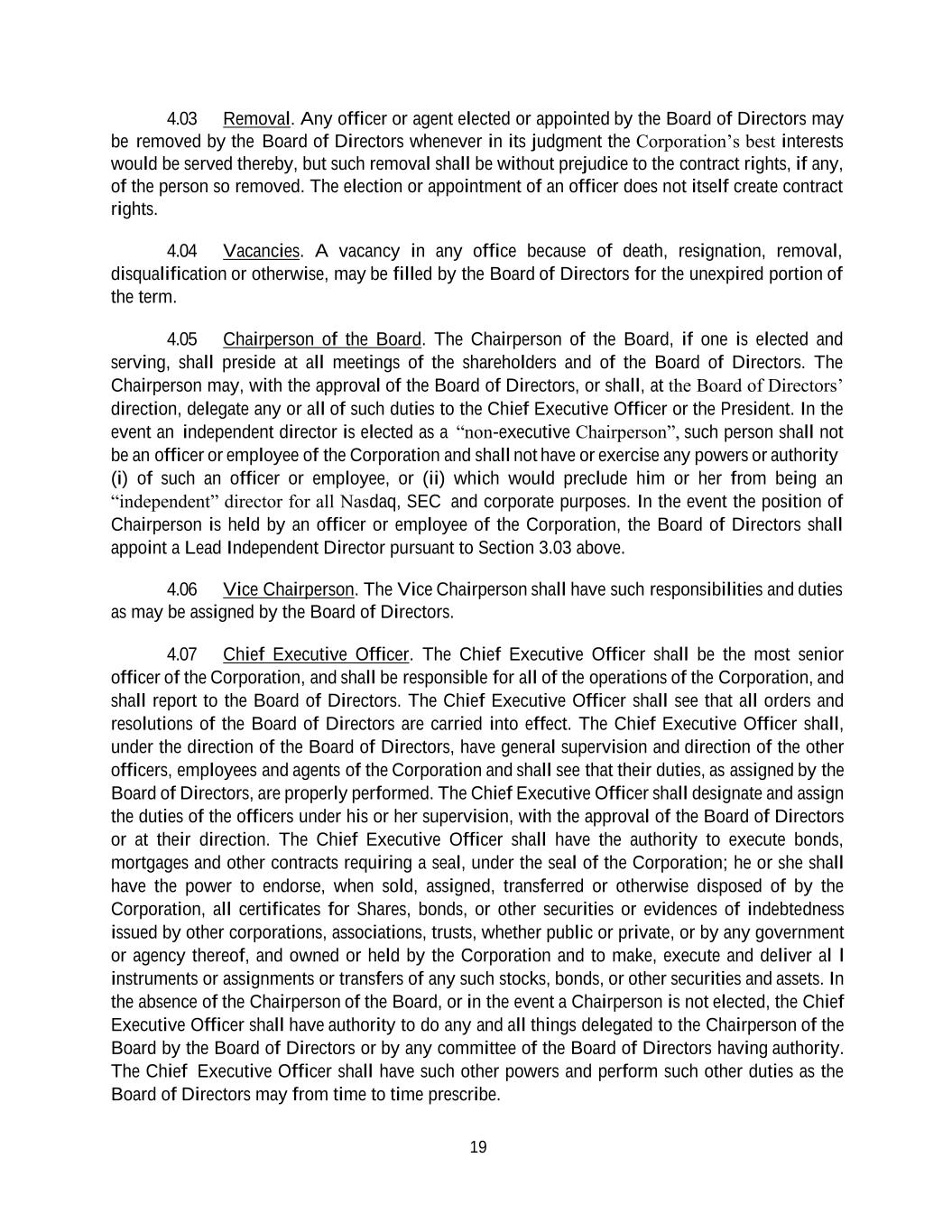19 4.03 Removal. Any officer or agent elected or appointed by the Board of Directors may be removed by the Board of Directors whenever in its judgment the Corporation’s best interests would be served thereby, but such removal shall be without prejudice to the contract rights, if any, of the person so removed. The election or appointment of an officer does not itself create contract rights. 4.04 Vacancies. A vacancy in any office because of death, resignation, removal, disqualification or otherwise, may be filled by the Board of Directors for the unexpired portion of the term. 4.05 Chairperson of the Board. The Chairperson of the Board, if one is elected and serving, shall preside at all meetings of the shareholders and of the Board of Directors. The Chairperson may, with the approval of the Board of Directors, or shall, at the Board of Directors’ direction, delegate any or all of such duties to the Chief Executive Officer or the President. In the event an independent director is elected as a “non-executive Chairperson”, such person shall not be an officer or employee of the Corporation and shall not have or exercise any powers or authority (i) of such an officer or employee, or (ii) which would preclude him or her from being an “independent” director for all Nasdaq, SEC and corporate purposes. In the event the position of Chairperson is held by an officer or employee of the Corporation, the Board of Directors shall appoint a Lead Independent Director pursuant to Section 3.03 above. 4.06 Vice Chairperson. The Vice Chairperson shall have such responsibilities and duties as may be assigned by the Board of Directors. 4.07 Chief Executive Officer. The Chief Executive Officer shall be the most senior officer of the Corporation, and shall be responsible for all of the operations of the Corporation, and shall report to the Board of Directors. The Chief Executive Officer shall see that all orders and resolutions of the Board of Directors are carried into effect. The Chief Executive Officer shall, under the direction of the Board of Directors, have general supervision and direction of the other officers, employees and agents of the Corporation and shall see that their duties, as assigned by the Board of Directors, are properly performed. The Chief Executive Officer shall designate and assign the duties of the officers under his or her supervision, with the approval of the Board of Directors or at their direction. The Chief Executive Officer shall have the authority to execute bonds, mortgages and other contracts requiring a seal, under the seal of the Corporation; he or she shall have the power to endorse, when sold, assigned, transferred or otherwise disposed of by the Corporation, all certificates for Shares, bonds, or other securities or evidences of indebtedness issued by other corporations, associations, trusts, whether public or private, or by any government or agency thereof, and owned or held by the Corporation and to make, execute and deliver al l instruments or assignments or transfers of any such stocks, bonds, or other securities and assets. In the absence of the Chairperson of the Board, or in the event a Chairperson is not elected, the Chief Executive Officer shall have authority to do any and all things delegated to the Chairperson of the Board by the Board of Directors or by any committee of the Board of Directors having authority. The Chief Executive Officer shall have such other powers and perform such other duties as the Board of Directors may from time to time prescribe.
