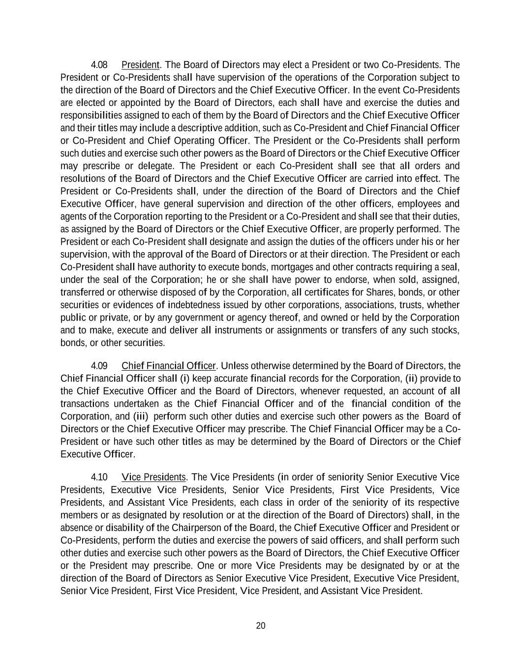 20 4.08 President. The Board of Directors may elect a President or two Co-Presidents. The President or Co-Presidents shall have supervision of the operations of the Corporation subject to the direction of the Board of Directors and the Chief Executive Officer. In the event Co-Presidents are elected or appointed by the Board of Directors, each shall have and exercise the duties and responsibilities assigned to each of them by the Board of Directors and the Chief Executive Officer and their titles may include a descriptive addition, such as Co-President and Chief Financial Officer or Co-President and Chief Operating Officer. The President or the Co-Presidents shall perform such duties and exercise such other powers as the Board of Directors or the Chief Executive Officer may prescribe or delegate. The President or each Co-President shall see that all orders and resolutions of the Board of Directors and the Chief Executive Officer are carried into effect. The President or Co-Presidents shall, under the direction of the Board of Directors and the Chief Executive Officer, have general supervision and direction of the other officers, employees and agents of the Corporation reporting to the President or a Co-President and shall see that their duties, as assigned by the Board of Directors or the Chief Executive Officer, are properly performed. The President or each Co-President shall designate and assign the duties of the officers under his or her supervision, with the approval of the Board of Directors or at their direction. The President or each Co-President shall have authority to execute bonds, mortgages and other contracts requiring a seal, under the seal of the Corporation; he or she shall have power to endorse, when sold, assigned, transferred or otherwise disposed of by the Corporation, all certificates for Shares, bonds, or other securities or evidences of indebtedness issued by other corporations, associations, trusts, whether public or private, or by any government or agency thereof, and owned or held by the Corporation and to make, execute and deliver all instruments or assignments or transfers of any such stocks, bonds, or other securities. 4.09 Chief Financial Officer. Unless otherwise determined by the Board of Directors, the Chief Financial Officer shall (i) keep accurate financial records for the Corporation, (ii) provide to the Chief Executive Officer and the Board of Directors, whenever requested, an account of all transactions undertaken as the Chief Financial Officer and of the financial condition of the Corporation, and (iii) perform such other duties and exercise such other powers as the Board of Directors or the Chief Executive Officer may prescribe. The Chief Financial Officer may be a Co- President or have such other titles as may be determined by the Board of Directors or the Chief Executive Officer. 4.10 Vice Presidents. The Vice Presidents (in order of seniority Senior Executive Vice Presidents, Executive Vice Presidents, Senior Vice Presidents, First Vice Presidents, Vice Presidents, and Assistant Vice Presidents, each class in order of the seniority of its respective members or as designated by resolution or at the direction of the Board of Directors) shall, in the absence or disability of the Chairperson of the Board, the Chief Executive Officer and President or Co-Presidents, perform the duties and exercise the powers of said officers, and shall perform such other duties and exercise such other powers as the Board of Directors, the Chief Executive Officer or the President may prescribe. One or more Vice Presidents may be designated by or at the direction of the Board of Directors as Senior Executive Vice President, Executive Vice President, Senior Vice President, First Vice President, Vice President, and Assistant Vice President.