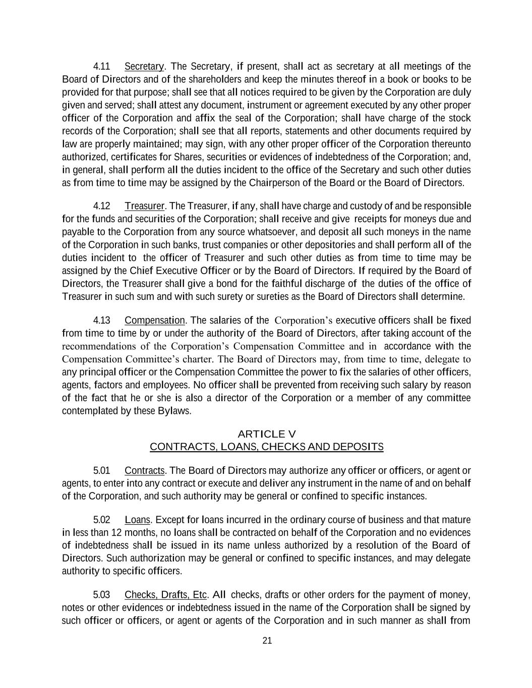 21 4.11 Secretary. The Secretary, if present, shall act as secretary at all meetings of the Board of Directors and of the shareholders and keep the minutes thereof in a book or books to be provided for that purpose; shall see that all notices required to be given by the Corporation are duly given and served; shall attest any document, instrument or agreement executed by any other proper officer of the Corporation and affix the seal of the Corporation; shall have charge of the stock records of the Corporation; shall see that all reports, statements and other documents required by law are properly maintained; may sign, with any other proper officer of the Corporation thereunto authorized, certificates for Shares, securities or evidences of indebtedness of the Corporation; and, in general, shall perform all the duties incident to the office of the Secretary and such other duties as from time to time may be assigned by the Chairperson of the Board or the Board of Directors. 4.12 Treasurer. The Treasurer, if any, shall have charge and custody of and be responsible for the funds and securities of the Corporation; shall receive and give receipts for moneys due and payable to the Corporation from any source whatsoever, and deposit all such moneys in the name of the Corporation in such banks, trust companies or other depositories and shall perform all of the duties incident to the officer of Treasurer and such other duties as from time to time may be assigned by the Chief Executive Officer or by the Board of Directors. If required by the Board of Directors, the Treasurer shall give a bond for the faithful discharge of the duties of the office of Treasurer in such sum and with such surety or sureties as the Board of Directors shall determine. 4.13 Compensation. The salaries of the Corporation’s executive officers shall be fixed from time to time by or under the authority of the Board of Directors, after taking account of the recommendations of the Corporation’s Compensation Committee and in accordance with the Compensation Committee’s charter. The Board of Directors may, from time to time, delegate to any principal officer or the Compensation Committee the power to fix the salaries of other officers, agents, factors and employees. No officer shall be prevented from receiving such salary by reason of the fact that he or she is also a director of the Corporation or a member of any committee contemplated by these Bylaws. ARTICLE V CONTRACTS, LOANS, CHECKS AND DEPOSITS 5.01 Contracts. The Board of Directors may authorize any officer or officers, or agent or agents, to enter into any contract or execute and deliver any instrument in the name of and on behalf of the Corporation, and such authority may be general or confined to specific instances. 5.02 Loans. Except for loans incurred in the ordinary course of business and that mature in less than 12 months, no loans shall be contracted on behalf of the Corporation and no evidences of indebtedness shall be issued in its name unless authorized by a resolution of the Board of Directors. Such authorization may be general or confined to specific instances, and may delegate authority to specific officers. 5.03 Checks, Drafts, Etc. All checks, drafts or other orders for the payment of money, notes or other evidences or indebtedness issued in the name of the Corporation shall be signed by such officer or officers, or agent or agents of the Corporation and in such manner as shall from