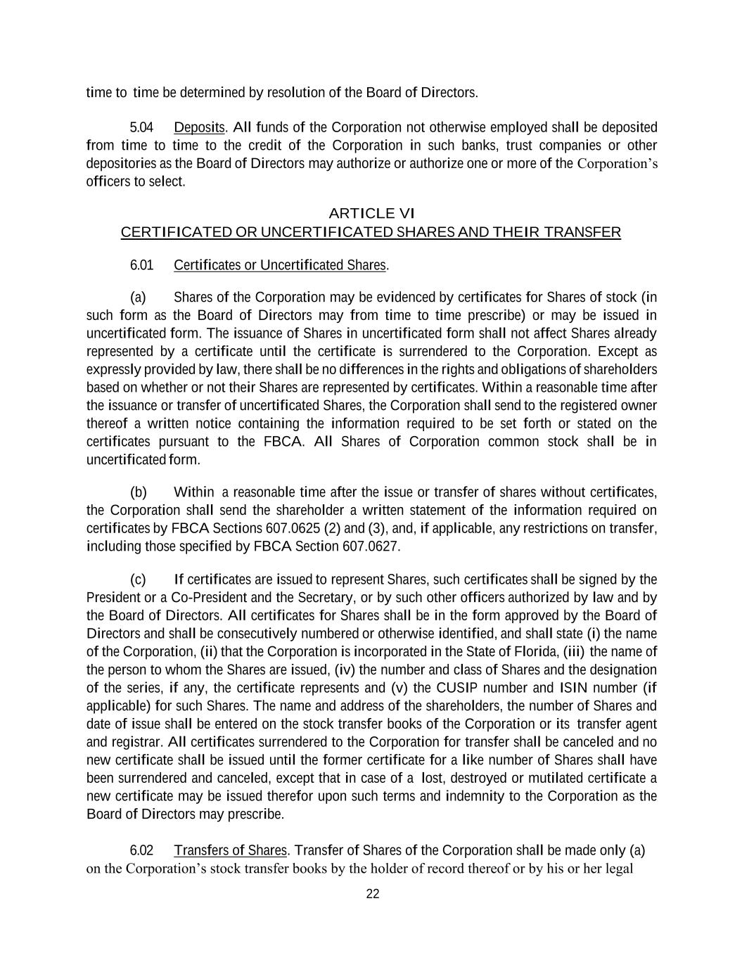 22 time to time be determined by resolution of the Board of Directors. 5.04 Deposits. All funds of the Corporation not otherwise employed shall be deposited from time to time to the credit of the Corporation in such banks, trust companies or other depositories as the Board of Directors may authorize or authorize one or more of the Corporation’s officers to select. ARTICLE VI CERTIFICATED OR UNCERTIFICATED SHARES AND THEIR TRANSFER 6.01 Certificates or Uncertificated Shares. (a) Shares of the Corporation may be evidenced by certificates for Shares of stock (in such form as the Board of Directors may from time to time prescribe) or may be issued in uncertificated form. The issuance of Shares in uncertificated form shall not affect Shares already represented by a certificate until the certificate is surrendered to the Corporation. Except as expressly provided by law, there shall be no differences in the rights and obligations of shareholders based on whether or not their Shares are represented by certificates. Within a reasonable time after the issuance or transfer of uncertificated Shares, the Corporation shall send to the registered owner thereof a written notice containing the information required to be set forth or stated on the certificates pursuant to the FBCA. All Shares of Corporation common stock shall be in uncertificated form. (b) Within a reasonable time after the issue or transfer of shares without certificates, the Corporation shall send the shareholder a written statement of the information required on certificates by FBCA Sections 607.0625 (2) and (3), and, if applicable, any restrictions on transfer, including those specified by FBCA Section 607.0627. (c) If certificates are issued to represent Shares, such certificates shall be signed by the President or a Co-President and the Secretary, or by such other officers authorized by law and by the Board of Directors. All certificates for Shares shall be in the form approved by the Board of Directors and shall be consecutively numbered or otherwise identified, and shall state (i) the name of the Corporation, (ii) that the Corporation is incorporated in the State of Florida, (iii) the name of the person to whom the Shares are issued, (iv) the number and class of Shares and the designation of the series, if any, the certificate represents and (v) the CUSIP number and ISIN number (if applicable) for such Shares. The name and address of the shareholders, the number of Shares and date of issue shall be entered on the stock transfer books of the Corporation or its transfer agent and registrar. All certificates surrendered to the Corporation for transfer shall be canceled and no new certificate shall be issued until the former certificate for a like number of Shares shall have been surrendered and canceled, except that in case of a lost, destroyed or mutilated certificate a new certificate may be issued therefor upon such terms and indemnity to the Corporation as the Board of Directors may prescribe. 6.02 Transfers of Shares. Transfer of Shares of the Corporation shall be made only (a) on the Corporation’s stock transfer books by the holder of record thereof or by his or her legal
