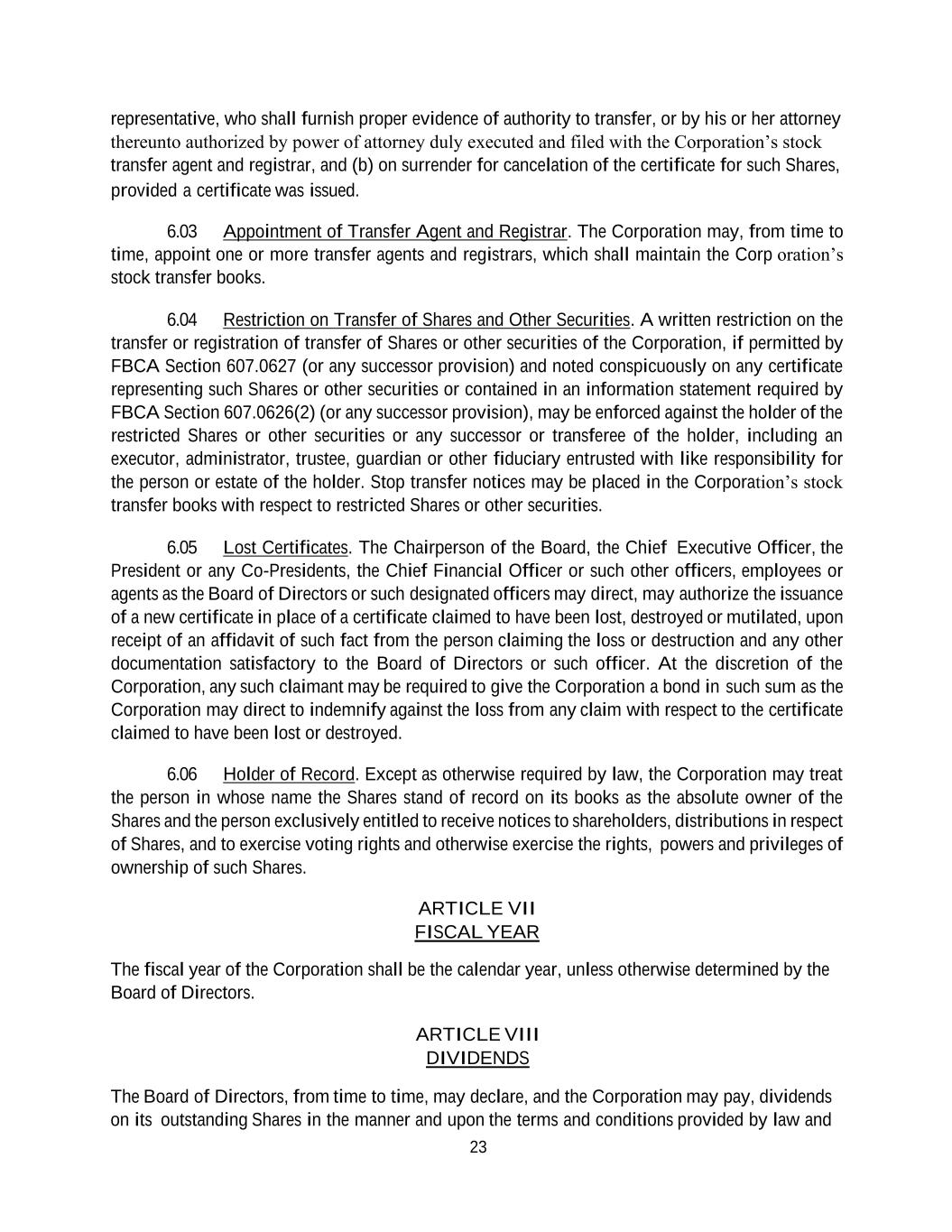 23 representative, who shall furnish proper evidence of authority to transfer, or by his or her attorney thereunto authorized by power of attorney duly executed and filed with the Corporation’s stock transfer agent and registrar, and (b) on surrender for cancelation of the certificate for such Shares, provided a certificate was issued. 6.03 Appointment of Transfer Agent and Registrar. The Corporation may, from time to time, appoint one or more transfer agents and registrars, which shall maintain the Corp oration’s stock transfer books. 6.04 Restriction on Transfer of Shares and Other Securities. A written restriction on the transfer or registration of transfer of Shares or other securities of the Corporation, if permitted by FBCA Section 607.0627 (or any successor provision) and noted conspicuously on any certificate representing such Shares or other securities or contained in an information statement required by FBCA Section 607.0626(2) (or any successor provision), may be enforced against the holder of the restricted Shares or other securities or any successor or transferee of the holder, including an executor, administrator, trustee, guardian or other fiduciary entrusted with like responsibility for the person or estate of the holder. Stop transfer notices may be placed in the Corporation’s stock transfer books with respect to restricted Shares or other securities. 6.05 Lost Certificates. The Chairperson of the Board, the Chief Executive Officer, the President or any Co-Presidents, the Chief Financial Officer or such other officers, employees or agents as the Board of Directors or such designated officers may direct, may authorize the issuance of a new certificate in place of a certificate claimed to have been lost, destroyed or mutilated, upon receipt of an affidavit of such fact from the person claiming the loss or destruction and any other documentation satisfactory to the Board of Directors or such officer. At the discretion of the Corporation, any such claimant may be required to give the Corporation a bond in such sum as the Corporation may direct to indemnify against the loss from any claim with respect to the certificate claimed to have been lost or destroyed. 6.06 Holder of Record. Except as otherwise required by law, the Corporation may treat the person in whose name the Shares stand of record on its books as the absolute owner of the Shares and the person exclusively entitled to receive notices to shareholders, distributions in respect of Shares, and to exercise voting rights and otherwise exercise the rights, powers and privileges of ownership of such Shares. ARTICLE VII FISCAL YEAR The fiscal year of the Corporation shall be the calendar year, unless otherwise determined by the Board of Directors. ARTICLE VIII DIVIDENDS The Board of Directors, from time to time, may declare, and the Corporation may pay, dividends on its outstanding Shares in the manner and upon the terms and conditions provided by law and