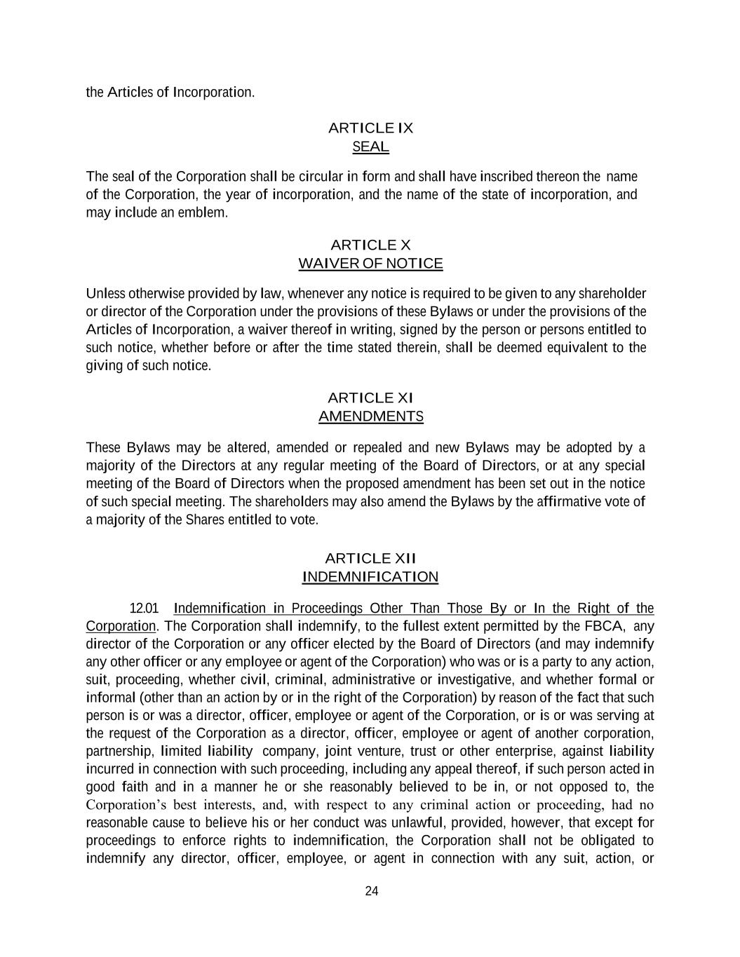 24 the Articles of Incorporation. ARTICLE IX SEAL The seal of the Corporation shall be circular in form and shall have inscribed thereon the name of the Corporation, the year of incorporation, and the name of the state of incorporation, and may include an emblem. ARTICLE X WAIVER OF NOTICE Unless otherwise provided by law, whenever any notice is required to be given to any shareholder or director of the Corporation under the provisions of these Bylaws or under the provisions of the Articles of Incorporation, a waiver thereof in writing, signed by the person or persons entitled to such notice, whether before or after the time stated therein, shall be deemed equivalent to the giving of such notice. ARTICLE XI AMENDMENTS These Bylaws may be altered, amended or repealed and new Bylaws may be adopted by a majority of the Directors at any regular meeting of the Board of Directors, or at any special meeting of the Board of Directors when the proposed amendment has been set out in the notice of such special meeting. The shareholders may also amend the Bylaws by the affirmative vote of a majority of the Shares entitled to vote. ARTICLE XII INDEMNIFICATION 12.01 Indemnification in Proceedings Other Than Those By or In the Right of the Corporation. The Corporation shall indemnify, to the fullest extent permitted by the FBCA, any director of the Corporation or any officer elected by the Board of Directors (and may indemnify any other officer or any employee or agent of the Corporation) who was or is a party to any action, suit, proceeding, whether civil, criminal, administrative or investigative, and whether formal or informal (other than an action by or in the right of the Corporation) by reason of the fact that such person is or was a director, officer, employee or agent of the Corporation, or is or was serving at the request of the Corporation as a director, officer, employee or agent of another corporation, partnership, limited liability company, joint venture, trust or other enterprise, against liability incurred in connection with such proceeding, including any appeal thereof, if such person acted in good faith and in a manner he or she reasonably believed to be in, or not opposed to, the Corporation’s best interests, and, with respect to any criminal action or proceeding, had no reasonable cause to believe his or her conduct was unlawful, provided, however, that except for proceedings to enforce rights to indemnification, the Corporation shall not be obligated to indemnify any director, officer, employee, or agent in connection with any suit, action, or