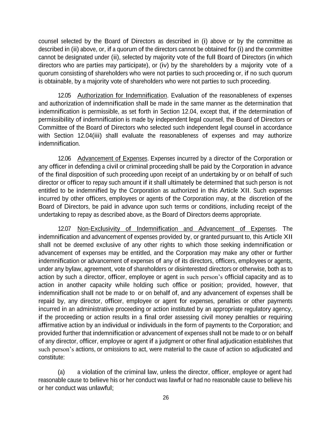 26 counsel selected by the Board of Directors as described in (i) above or by the committee as described in (ii) above, or, if a quorum of the directors cannot be obtained for (i) and the committee cannot be designated under (ii), selected by majority vote of the full Board of Directors (in which directors who are parties may participate), or (iv) by the shareholders by a majority vote of a quorum consisting of shareholders who were not parties to such proceeding or, if no such quorum is obtainable, by a majority vote of shareholders who were not parties to such proceeding. 12.05 Authorization for Indemnification. Evaluation of the reasonableness of expenses and authorization of indemnification shall be made in the same manner as the determination that indemnification is permissible, as set forth in Section 12.04, except that, if the determination of permissibility of indemnification is made by independent legal counsel, the Board of Directors or Committee of the Board of Directors who selected such independent legal counsel in accordance with Section 12.04(iii) shall evaluate the reasonableness of expenses and may authorize indemnification. 12.06 Advancement of Expenses. Expenses incurred by a director of the Corporation or any officer in defending a civil or criminal proceeding shall be paid by the Corporation in advance of the final disposition of such proceeding upon receipt of an undertaking by or on behalf of such director or officer to repay such amount if it shall ultimately be determined that such person is not entitled to be indemnified by the Corporation as authorized in this Article XII. Such expenses incurred by other officers, employees or agents of the Corporation may, at the discretion of the Board of Directors, be paid in advance upon such terms or conditions, including receipt of the undertaking to repay as described above, as the Board of Directors deems appropriate. 12.07 Non-Exclusivity of Indemnification and Advancement of Expenses. The indemnification and advancement of expenses provided by, or granted pursuant to, this Article XII shall not be deemed exclusive of any other rights to which those seeking indemnification or advancement of expenses may be entitled, and the Corporation may make any other or further indemnification or advancement of expenses of any of its directors, officers, employees or agents, under any bylaw, agreement, vote of shareholders or disinterested directors or otherwise, both as to action by such a director, officer, employee or agent in such person’s official capacity and as to action in another capacity while holding such office or position; provided, however, that indemnification shall not be made to or on behalf of, and any advancement of expenses shall be repaid by, any director, officer, employee or agent for expenses, penalties or other payments incurred in an administrative proceeding or action instituted by an appropriate regulatory agency, if the proceeding or action results in a final order assessing civil money penalties or requiring affirmative action by an individual or individuals in the form of payments to the Corporation; and provided further that indemnification or advancement of expenses shall not be made to or on behalf of any director, officer, employee or agent if a judgment or other final adjudication establishes that such person’s actions, or omissions to act, were material to the cause of action so adjudicated and constitute: (a) a violation of the criminal law, unless the director, officer, employee or agent had reasonable cause to believe his or her conduct was lawful or had no reasonable cause to believe his or her conduct was unlawful;