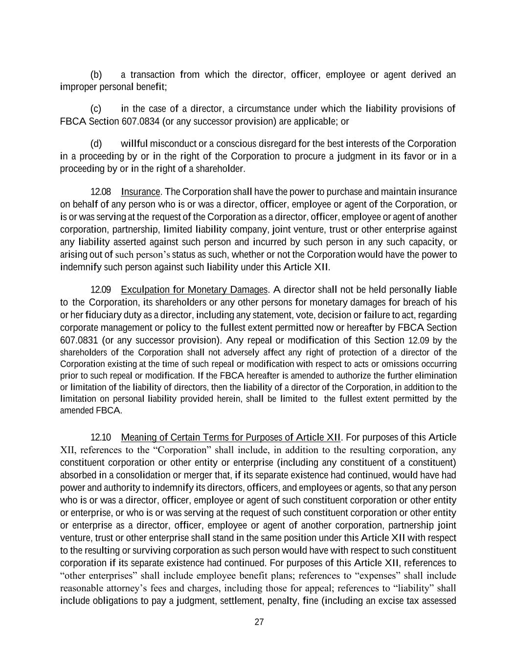 27 (b) a transaction from which the director, officer, employee or agent derived an improper personal benefit; (c) in the case of a director, a circumstance under which the liability provisions of FBCA Section 607.0834 (or any successor provision) are applicable; or (d) willful misconduct or a conscious disregard for the best interests of the Corporation in a proceeding by or in the right of the Corporation to procure a judgment in its favor or in a proceeding by or in the right of a shareholder. 12.08 Insurance. The Corporation shall have the power to purchase and maintain insurance on behalf of any person who is or was a director, officer, employee or agent of the Corporation, or is or was serving at the request of the Corporation as a director, officer, employee or agent of another corporation, partnership, limited liability company, joint venture, trust or other enterprise against any liability asserted against such person and incurred by such person in any such capacity, or arising out of such person’s status as such, whether or not the Corporation would have the power to indemnify such person against such liability under this Article XII. 12.09 Exculpation for Monetary Damages. A director shall not be held personally liable to the Corporation, its shareholders or any other persons for monetary damages for breach of his or her fiduciary duty as a director, including any statement, vote, decision or failure to act, regarding corporate management or policy to the fullest extent permitted now or hereafter by FBCA Section 607.0831 (or any successor provision). Any repeal or modification of this Section 12.09 by the shareholders of the Corporation shall not adversely affect any right of protection of a director of the Corporation existing at the time of such repeal or modification with respect to acts or omissions occurring prior to such repeal or modification. If the FBCA hereafter is amended to authorize the further elimination or limitation of the liability of directors, then the liability of a director of the Corporation, in addition to the limitation on personal liability provided herein, shall be limited to the fullest extent permitted by the amended FBCA. 12.10 Meaning of Certain Terms for Purposes of Article XII. For purposes of this Article XII, references to the “Corporation” shall include, in addition to the resulting corporation, any constituent corporation or other entity or enterprise (including any constituent of a constituent) absorbed in a consolidation or merger that, if its separate existence had continued, would have had power and authority to indemnify its directors, officers, and employees or agents, so that any person who is or was a director, officer, employee or agent of such constituent corporation or other entity or enterprise, or who is or was serving at the request of such constituent corporation or other entity or enterprise as a director, officer, employee or agent of another corporation, partnership joint venture, trust or other enterprise shall stand in the same position under this Article XII with respect to the resulting or surviving corporation as such person would have with respect to such constituent corporation if its separate existence had continued. For purposes of this Article XII, references to “other enterprises” shall include employee benefit plans; references to “expenses” shall include reasonable attorney’s fees and charges, including those for appeal; references to “liability” shall include obligations to pay a judgment, settlement, penalty, fine (including an excise tax assessed