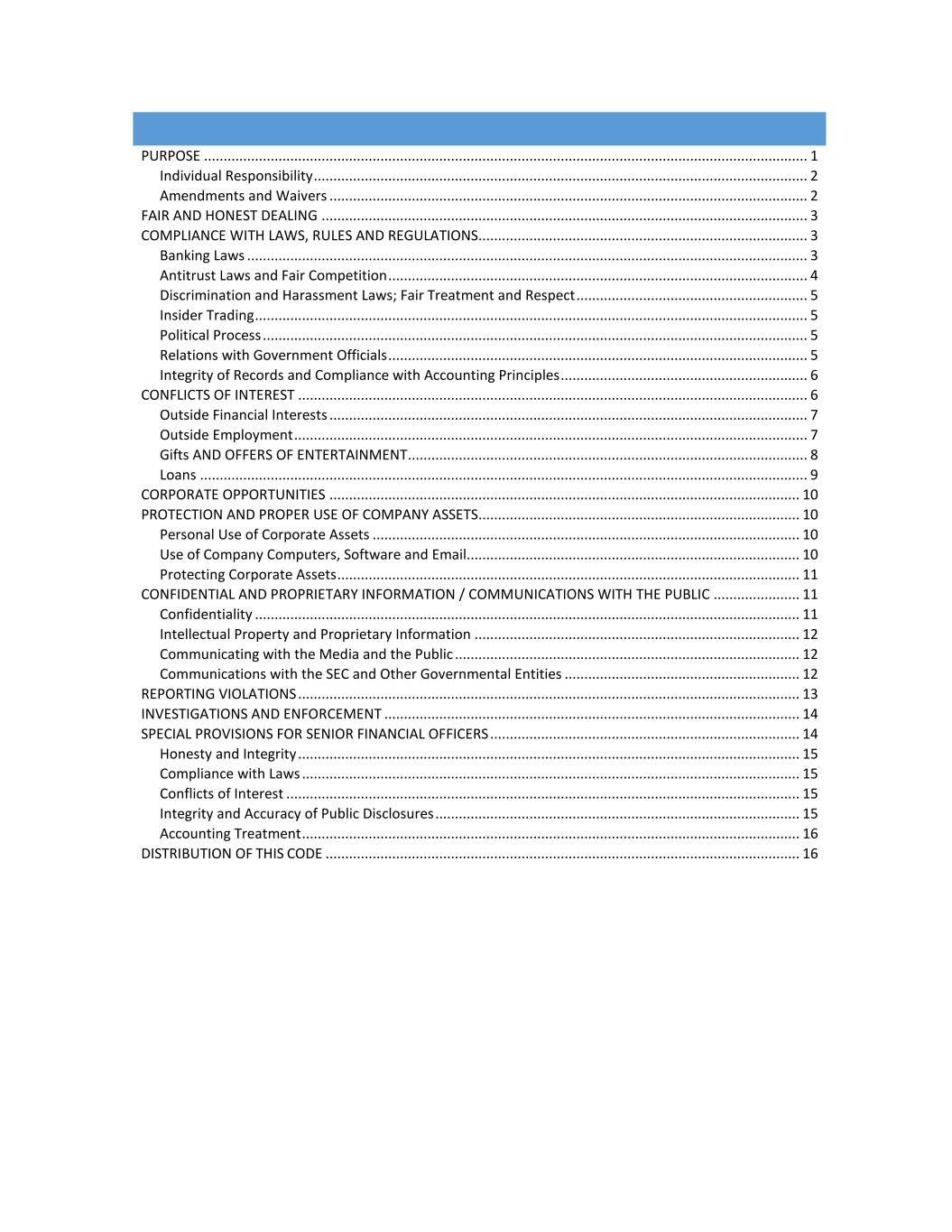 PURPOSE .......................................................................................................................................................... 1 Individual Responsibility .............................................................................................................................. 2 Amendments and Waivers .......................................................................................................................... 2 FAIR AND HONEST DEALING ............................................................................................................................ 3 COMPLIANCE WITH LAWS, RULES AND REGULATIONS.................................................................................... 3 Banking Laws ............................................................................................................................................... 3 Antitrust Laws and Fair Competition ........................................................................................................... 4 Discrimination and Harassment Laws; Fair Treatment and Respect ........................................................... 5 Insider Trading ............................................................................................................................................. 5 Political Process ........................................................................................................................................... 5 Relations with Government Officials ........................................................................................................... 5 Integrity of Records and Compliance with Accounting Principles ............................................................... 6 CONFLICTS OF INTEREST .................................................................................................................................. 6 Outside Financial Interests .......................................................................................................................... 7 Outside Employment ................................................................................................................................... 7 Gifts AND OFFERS OF ENTERTAINMENT ...................................................................................................... 8 Loans ........................................................................................................................................................... 9 CORPORATE OPPORTUNITIES ........................................................................................................................ 10 PROTECTION AND PROPER USE OF COMPANY ASSETS.................................................................................. 10 Personal Use of Corporate Assets ............................................................................................................. 10 Use of Company Computers, Software and Email..................................................................................... 10 Protecting Corporate Assets ...................................................................................................................... 11 CONFIDENTIAL AND PROPRIETARY INFORMATION / COMMUNICATIONS WITH THE PUBLIC ...................... 11 Confidentiality ........................................................................................................................................... 11 Intellectual Property and Proprietary Information ................................................................................... 12 Communicating with the Media and the Public ........................................................................................ 12 Communications with the SEC and Other Governmental Entities ............................................................ 12 REPORTING VIOLATIONS ................................................................................................................................ 13 INVESTIGATIONS AND ENFORCEMENT .......................................................................................................... 14 SPECIAL PROVISIONS FOR SENIOR FINANCIAL OFFICERS ............................................................................... 14 Honesty and Integrity ................................................................................................................................ 15 Compliance with Laws ............................................................................................................................... 15 Conflicts of Interest ................................................................................................................................... 15 Integrity and Accuracy of Public Disclosures ............................................................................................. 15 Accounting Treatment ............................................................................................................................... 16 DISTRIBUTION OF THIS CODE ......................................................................................................................... 16