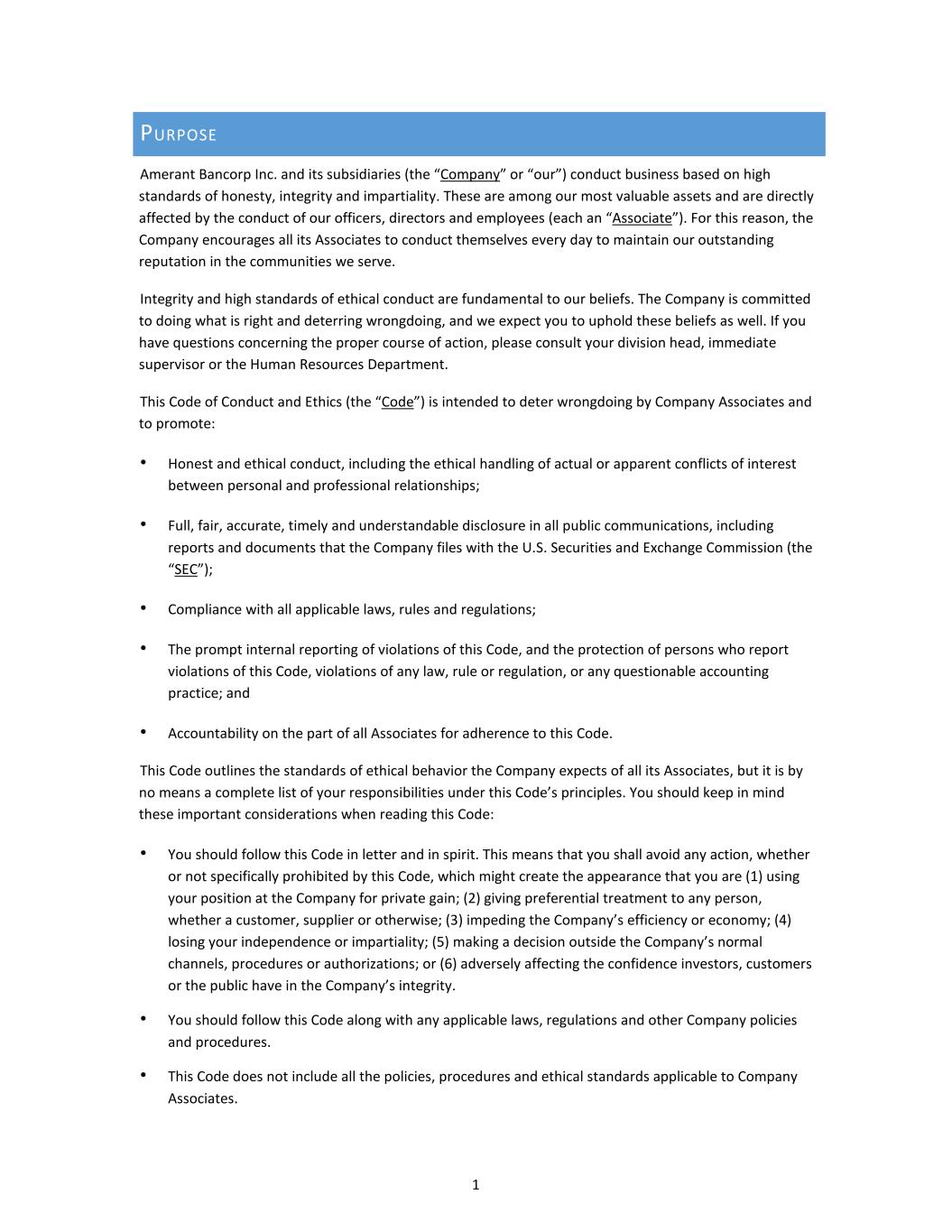 1 PURPOSE Amerant Bancorp Inc. and its subsidiaries (the “Company” or “our”) conduct business based on high standards of honesty, integrity and impartiality. These are among our most valuable assets and are directly affected by the conduct of our officers, directors and employees (each an “Associate”). For this reason, the Company encourages all its Associates to conduct themselves every day to maintain our outstanding reputation in the communities we serve. Integrity and high standards of ethical conduct are fundamental to our beliefs. The Company is committed to doing what is right and deterring wrongdoing, and we expect you to uphold these beliefs as well. If you have questions concerning the proper course of action, please consult your division head, immediate supervisor or the Human Resources Department. This Code of Conduct and Ethics (the “Code”) is intended to deter wrongdoing by Company Associates and to promote: • Honest and ethical conduct, including the ethical handling of actual or apparent conflicts of interest between personal and professional relationships; • Full, fair, accurate, timely and understandable disclosure in all public communications, including reports and documents that the Company files with the U.S. Securities and Exchange Commission (the “SEC”); • Compliance with all applicable laws, rules and regulations; • The prompt internal reporting of violations of this Code, and the protection of persons who report violations of this Code, violations of any law, rule or regulation, or any questionable accounting practice; and • Accountability on the part of all Associates for adherence to this Code. This Code outlines the standards of ethical behavior the Company expects of all its Associates, but it is by no means a complete list of your responsibilities under this Code’s principles. You should keep in mind these important considerations when reading this Code: • You should follow this Code in letter and in spirit. This means that you shall avoid any action, whether or not specifically prohibited by this Code, which might create the appearance that you are (1) using your position at the Company for private gain; (2) giving preferential treatment to any person, whether a customer, supplier or otherwise; (3) impeding the Company’s efficiency or economy; (4) losing your independence or impartiality; (5) making a decision outside the Company’s normal channels, procedures or authorizations; or (6) adversely affecting the confidence investors, customers or the public have in the Company’s integrity. • You should follow this Code along with any applicable laws, regulations and other Company policies and procedures. • This Code does not include all the policies, procedures and ethical standards applicable to Company Associates.