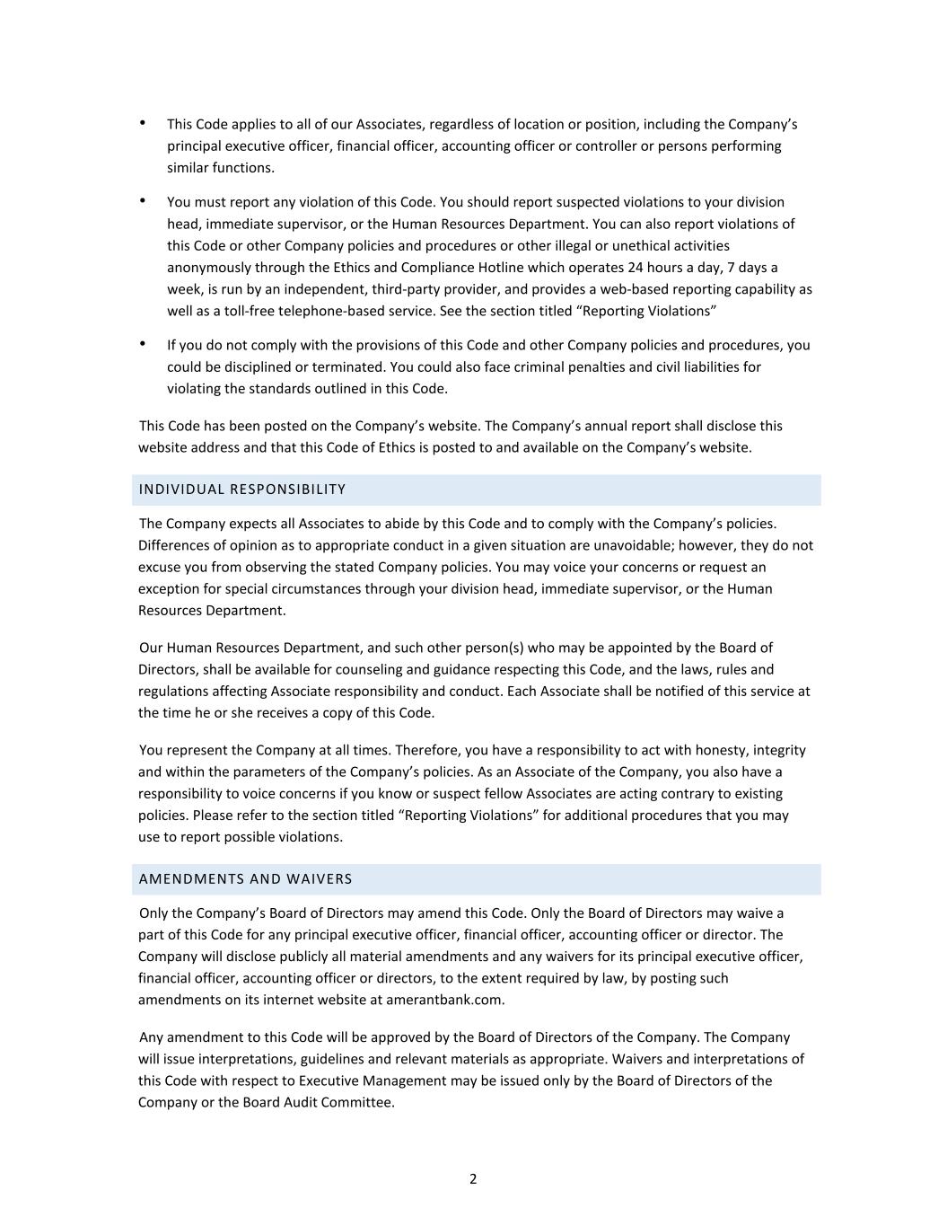 2 • This Code applies to all of our Associates, regardless of location or position, including the Company’s principal executive officer, financial officer, accounting officer or controller or persons performing similar functions. • You must report any violation of this Code. You should report suspected violations to your division head, immediate supervisor, or the Human Resources Department. You can also report violations of this Code or other Company policies and procedures or other illegal or unethical activities anonymously through the Ethics and Compliance Hotline which operates 24 hours a day, 7 days a week, is run by an independent, third-party provider, and provides a web-based reporting capability as well as a toll-free telephone-based service. See the section titled “Reporting Violations” • If you do not comply with the provisions of this Code and other Company policies and procedures, you could be disciplined or terminated. You could also face criminal penalties and civil liabilities for violating the standards outlined in this Code. This Code has been posted on the Company’s website. The Company’s annual report shall disclose this website address and that this Code of Ethics is posted to and available on the Company’s website. INDIVIDUAL RESPONSIBILITY The Company expects all Associates to abide by this Code and to comply with the Company’s policies. Differences of opinion as to appropriate conduct in a given situation are unavoidable; however, they do not excuse you from observing the stated Company policies. You may voice your concerns or request an exception for special circumstances through your division head, immediate supervisor, or the Human Resources Department. Our Human Resources Department, and such other person(s) who may be appointed by the Board of Directors, shall be available for counseling and guidance respecting this Code, and the laws, rules and regulations affecting Associate responsibility and conduct. Each Associate shall be notified of this service at the time he or she receives a copy of this Code. You represent the Company at all times. Therefore, you have a responsibility to act with honesty, integrity and within the parameters of the Company’s policies. As an Associate of the Company, you also have a responsibility to voice concerns if you know or suspect fellow Associates are acting contrary to existing policies. Please refer to the section titled “Reporting Violations” for additional procedures that you may use to report possible violations. AMENDMENTS AND WAIVERS Only the Company’s Board of Directors may amend this Code. Only the Board of Directors may waive a part of this Code for any principal executive officer, financial officer, accounting officer or director. The Company will disclose publicly all material amendments and any waivers for its principal executive officer, financial officer, accounting officer or directors, to the extent required by law, by posting such amendments on its internet website at amerantbank.com. Any amendment to this Code will be approved by the Board of Directors of the Company. The Company will issue interpretations, guidelines and relevant materials as appropriate. Waivers and interpretations of this Code with respect to Executive Management may be issued only by the Board of Directors of the Company or the Board Audit Committee.