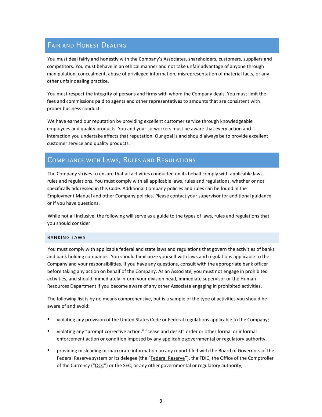 3 FAIR AND HONEST DEALING You must deal fairly and honestly with the Company’s Associates, shareholders, customers, suppliers and competitors. You must behave in an ethical manner and not take unfair advantage of anyone through manipulation, concealment, abuse of privileged information, misrepresentation of material facts, or any other unfair dealing practice. You must respect the integrity of persons and firms with whom the Company deals. You must limit the fees and commissions paid to agents and other representatives to amounts that are consistent with proper business conduct. We have earned our reputation by providing excellent customer service through knowledgeable employees and quality products. You and your co-workers must be aware that every action and interaction you undertake affects that reputation. Our goal is and should always be to provide excellent customer service and quality products. COMPLIANCE WITH LAWS, RULES AND REGULATIONS The Company strives to ensure that all activities conducted on its behalf comply with applicable laws, rules and regulations. You must comply with all applicable laws, rules and regulations, whether or not specifically addressed in this Code. Additional Company policies and rules can be found in the Employment Manual and other Company policies. Please contact your supervisor for additional guidance or if you have questions. While not all inclusive, the following will serve as a guide to the types of laws, rules and regulations that you should consider: BANKING LAWS You must comply with applicable federal and state laws and regulations that govern the activities of banks and bank holding companies. You should familiarize yourself with laws and regulations applicable to the Company and your responsibilities. If you have any questions, consult with the appropriate bank officer before taking any action on behalf of the Company. As an Associate, you must not engage in prohibited activities, and should immediately inform your division head, immediate supervisor or the Human Resources Department if you become aware of any other Associate engaging in prohibited activities. The following list is by no means comprehensive, but is a sample of the type of activities you should be aware of and avoid: • violating any provision of the United States Code or Federal regulations applicable to the Company; • violating any “prompt corrective action,” “cease and desist” order or other formal or informal enforcement action or condition imposed by any applicable governmental or regulatory authority. • providing misleading or inaccurate information on any report filed with the Board of Governors of the Federal Reserve system or its delegee (the “Federal Reserve”), the FDIC, the Office of the Comptroller of the Currency (“OCC”) or the SEC, or any other governmental or regulatory authority;