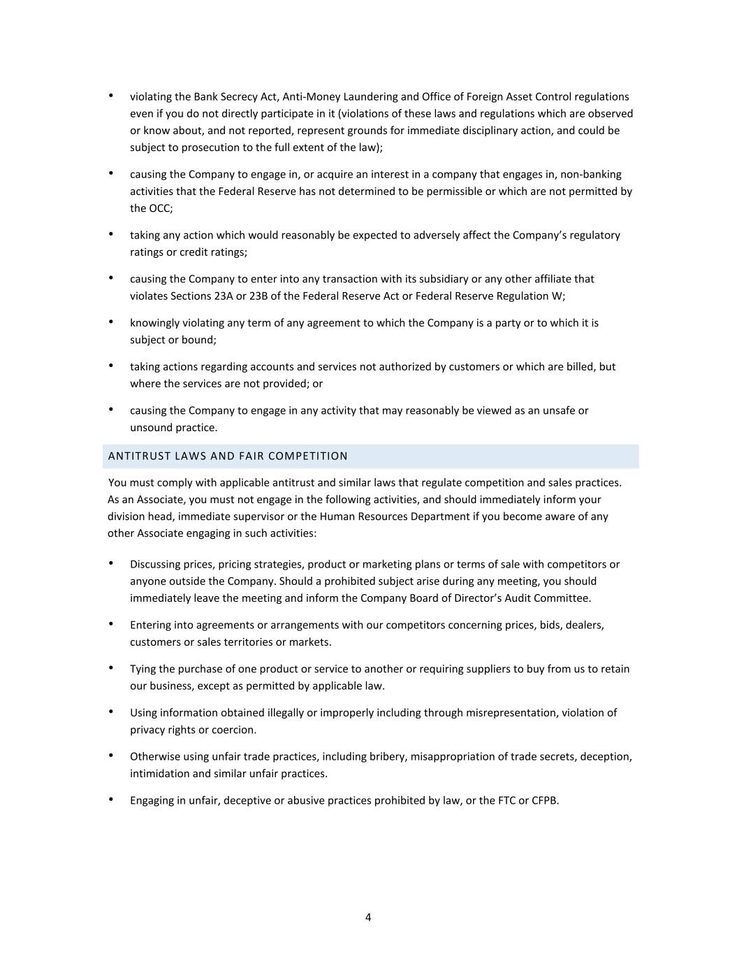 4 • violating the Bank Secrecy Act, Anti-Money Laundering and Office of Foreign Asset Control regulations even if you do not directly participate in it (violations of these laws and regulations which are observed or know about, and not reported, represent grounds for immediate disciplinary action, and could be subject to prosecution to the full extent of the law); • causing the Company to engage in, or acquire an interest in a company that engages in, non-banking activities that the Federal Reserve has not determined to be permissible or which are not permitted by the OCC; • taking any action which would reasonably be expected to adversely affect the Company’s regulatory ratings or credit ratings; • causing the Company to enter into any transaction with its subsidiary or any other affiliate that violates Sections 23A or 23B of the Federal Reserve Act or Federal Reserve Regulation W; • knowingly violating any term of any agreement to which the Company is a party or to which it is subject or bound; • taking actions regarding accounts and services not authorized by customers or which are billed, but where the services are not provided; or • causing the Company to engage in any activity that may reasonably be viewed as an unsafe or unsound practice. ANTITRUST LAWS AND FAIR COMPETITION You must comply with applicable antitrust and similar laws that regulate competition and sales practices. As an Associate, you must not engage in the following activities, and should immediately inform your division head, immediate supervisor or the Human Resources Department if you become aware of any other Associate engaging in such activities: • Discussing prices, pricing strategies, product or marketing plans or terms of sale with competitors or anyone outside the Company. Should a prohibited subject arise during any meeting, you should immediately leave the meeting and inform the Company Board of Director’s Audit Committee. • Entering into agreements or arrangements with our competitors concerning prices, bids, dealers, customers or sales territories or markets. • Tying the purchase of one product or service to another or requiring suppliers to buy from us to retain our business, except as permitted by applicable law. • Using information obtained illegally or improperly including through misrepresentation, violation of privacy rights or coercion. • Otherwise using unfair trade practices, including bribery, misappropriation of trade secrets, deception, intimidation and similar unfair practices. • Engaging in unfair, deceptive or abusive practices prohibited by law, or the FTC or CFPB.