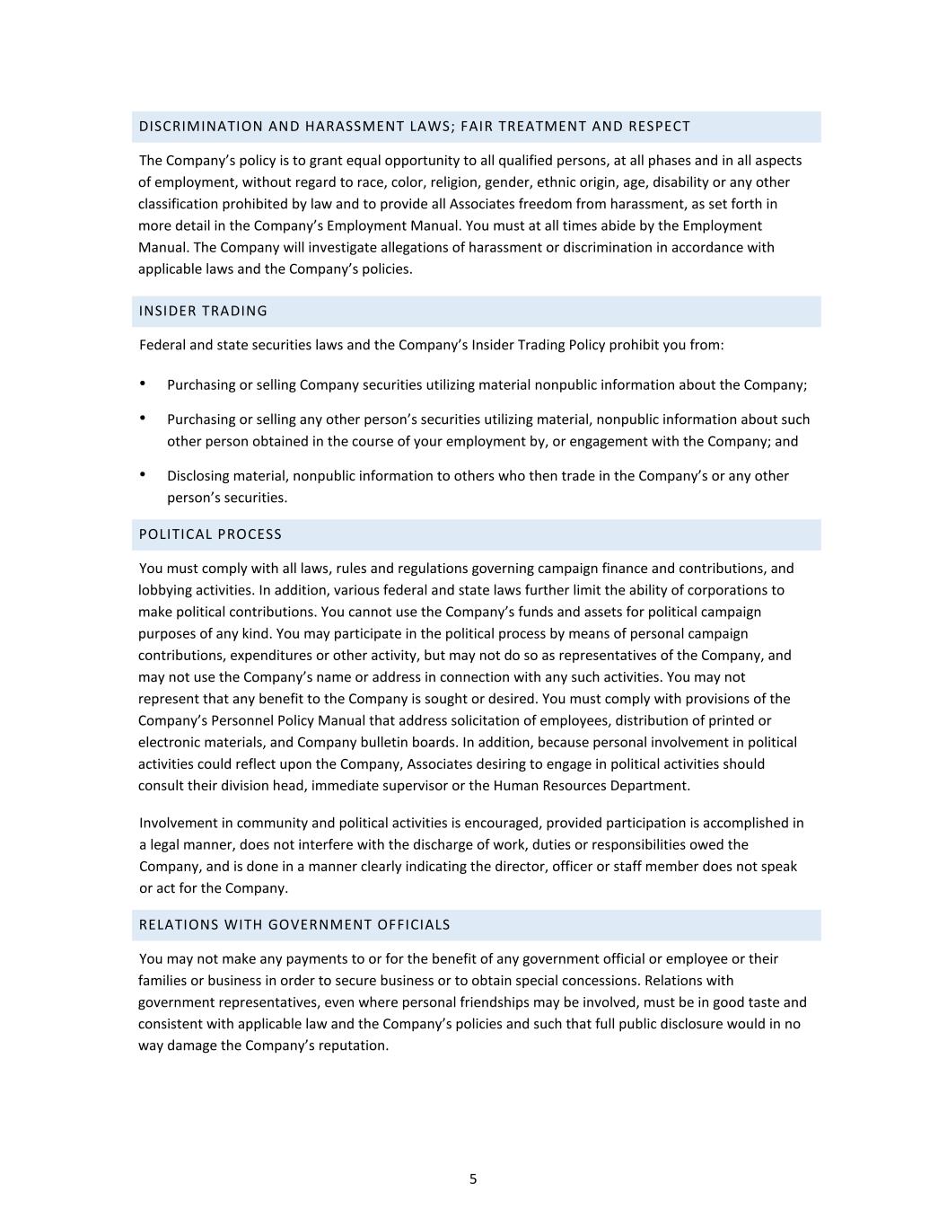 5 DISCRIMINATION AND HARASSMENT LAWS; FAIR TREATMENT AND RESPECT The Company’s policy is to grant equal opportunity to all qualified persons, at all phases and in all aspects of employment, without regard to race, color, religion, gender, ethnic origin, age, disability or any other classification prohibited by law and to provide all Associates freedom from harassment, as set forth in more detail in the Company’s Employment Manual. You must at all times abide by the Employment Manual. The Company will investigate allegations of harassment or discrimination in accordance with applicable laws and the Company’s policies. INSIDER TRADING Federal and state securities laws and the Company’s Insider Trading Policy prohibit you from: • Purchasing or selling Company securities utilizing material nonpublic information about the Company; • Purchasing or selling any other person’s securities utilizing material, nonpublic information about such other person obtained in the course of your employment by, or engagement with the Company; and • Disclosing material, nonpublic information to others who then trade in the Company’s or any other person’s securities. POLITICAL PROCESS You must comply with all laws, rules and regulations governing campaign finance and contributions, and lobbying activities. In addition, various federal and state laws further limit the ability of corporations to make political contributions. You cannot use the Company’s funds and assets for political campaign purposes of any kind. You may participate in the political process by means of personal campaign contributions, expenditures or other activity, but may not do so as representatives of the Company, and may not use the Company’s name or address in connection with any such activities. You may not represent that any benefit to the Company is sought or desired. You must comply with provisions of the Company’s Personnel Policy Manual that address solicitation of employees, distribution of printed or electronic materials, and Company bulletin boards. In addition, because personal involvement in political activities could reflect upon the Company, Associates desiring to engage in political activities should consult their division head, immediate supervisor or the Human Resources Department. Involvement in community and political activities is encouraged, provided participation is accomplished in a legal manner, does not interfere with the discharge of work, duties or responsibilities owed the Company, and is done in a manner clearly indicating the director, officer or staff member does not speak or act for the Company. RELATIONS WITH GOVERNMENT OFFICIALS You may not make any payments to or for the benefit of any government official or employee or their families or business in order to secure business or to obtain special concessions. Relations with government representatives, even where personal friendships may be involved, must be in good taste and consistent with applicable law and the Company’s policies and such that full public disclosure would in no way damage the Company’s reputation.