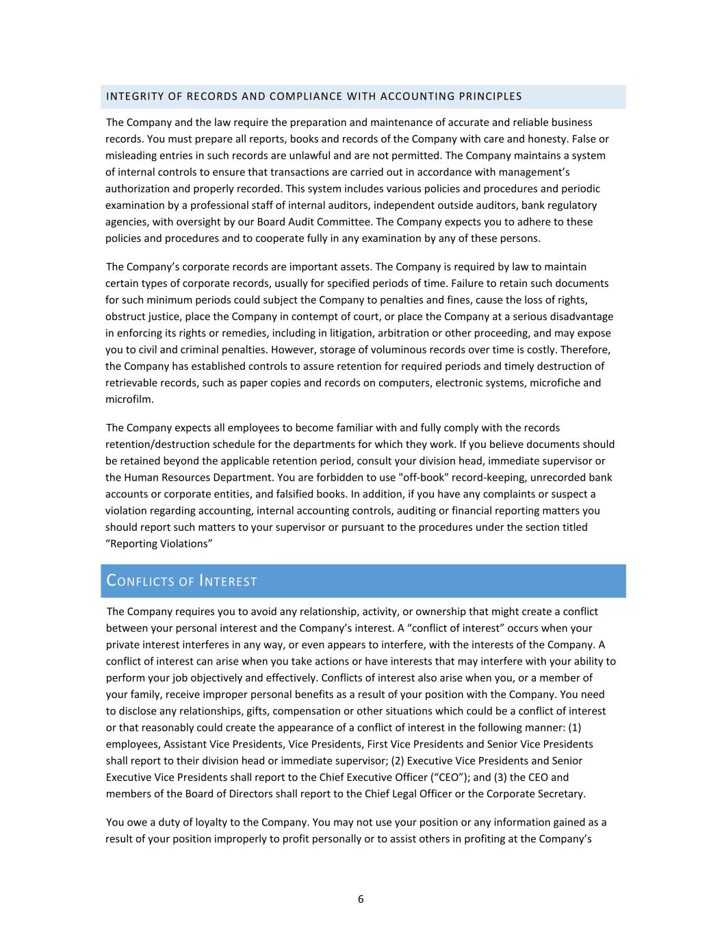 6 INTEGRITY OF RECORDS AND COMPLIANCE WITH ACCOUNTING PRINCIPLES The Company and the law require the preparation and maintenance of accurate and reliable business records. You must prepare all reports, books and records of the Company with care and honesty. False or misleading entries in such records are unlawful and are not permitted. The Company maintains a system of internal controls to ensure that transactions are carried out in accordance with management’s authorization and properly recorded. This system includes various policies and procedures and periodic examination by a professional staff of internal auditors, independent outside auditors, bank regulatory agencies, with oversight by our Board Audit Committee. The Company expects you to adhere to these policies and procedures and to cooperate fully in any examination by any of these persons. The Company’s corporate records are important assets. The Company is required by law to maintain certain types of corporate records, usually for specified periods of time. Failure to retain such documents for such minimum periods could subject the Company to penalties and fines, cause the loss of rights, obstruct justice, place the Company in contempt of court, or place the Company at a serious disadvantage in enforcing its rights or remedies, including in litigation, arbitration or other proceeding, and may expose you to civil and criminal penalties. However, storage of voluminous records over time is costly. Therefore, the Company has established controls to assure retention for required periods and timely destruction of retrievable records, such as paper copies and records on computers, electronic systems, microfiche and microfilm. The Company expects all employees to become familiar with and fully comply with the records retention/destruction schedule for the departments for which they work. If you believe documents should be retained beyond the applicable retention period, consult your division head, immediate supervisor or the Human Resources Department. You are forbidden to use "off-book" record-keeping, unrecorded bank accounts or corporate entities, and falsified books. In addition, if you have any complaints or suspect a violation regarding accounting, internal accounting controls, auditing or financial reporting matters you should report such matters to your supervisor or pursuant to the procedures under the section titled “Reporting Violations” CONFLICTS OF INTEREST The Company requires you to avoid any relationship, activity, or ownership that might create a conflict between your personal interest and the Company’s interest. A “conflict of interest” occurs when your private interest interferes in any way, or even appears to interfere, with the interests of the Company. A conflict of interest can arise when you take actions or have interests that may interfere with your ability to perform your job objectively and effectively. Conflicts of interest also arise when you, or a member of your family, receive improper personal benefits as a result of your position with the Company. You need to disclose any relationships, gifts, compensation or other situations which could be a conflict of interest or that reasonably could create the appearance of a conflict of interest in the following manner: (1) employees, Assistant Vice Presidents, Vice Presidents, First Vice Presidents and Senior Vice Presidents shall report to their division head or immediate supervisor; (2) Executive Vice Presidents and Senior Executive Vice Presidents shall report to the Chief Executive Officer (“CEO”); and (3) the CEO and members of the Board of Directors shall report to the Chief Legal Officer or the Corporate Secretary. You owe a duty of loyalty to the Company. You may not use your position or any information gained as a result of your position improperly to profit personally or to assist others in profiting at the Company’s