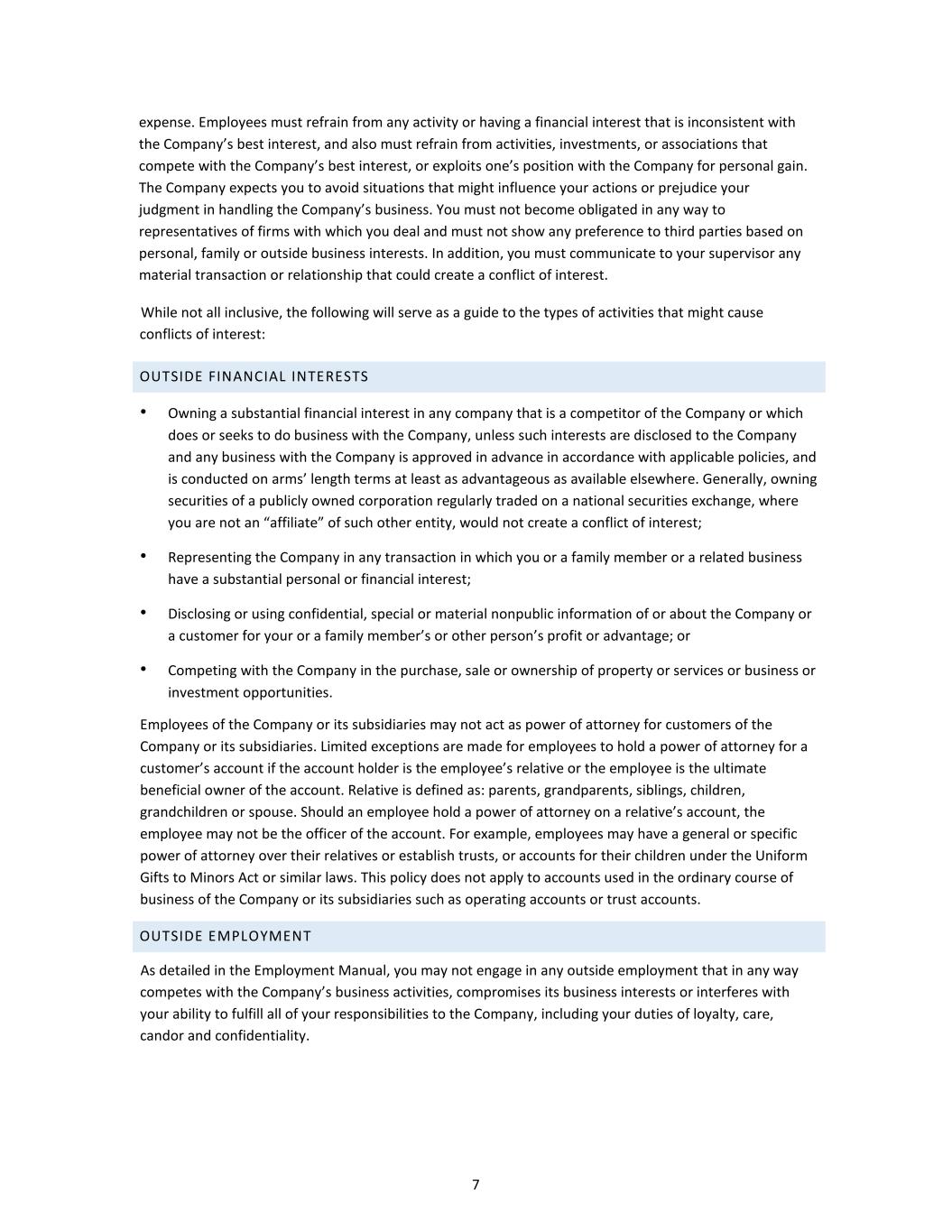 7 expense. Employees must refrain from any activity or having a financial interest that is inconsistent with the Company’s best interest, and also must refrain from activities, investments, or associations that compete with the Company’s best interest, or exploits one’s position with the Company for personal gain. The Company expects you to avoid situations that might influence your actions or prejudice your judgment in handling the Company’s business. You must not become obligated in any way to representatives of firms with which you deal and must not show any preference to third parties based on personal, family or outside business interests. In addition, you must communicate to your supervisor any material transaction or relationship that could create a conflict of interest. While not all inclusive, the following will serve as a guide to the types of activities that might cause conflicts of interest: OUTSIDE FINANCIAL INTERESTS • Owning a substantial financial interest in any company that is a competitor of the Company or which does or seeks to do business with the Company, unless such interests are disclosed to the Company and any business with the Company is approved in advance in accordance with applicable policies, and is conducted on arms’ length terms at least as advantageous as available elsewhere. Generally, owning securities of a publicly owned corporation regularly traded on a national securities exchange, where you are not an “affiliate” of such other entity, would not create a conflict of interest; • Representing the Company in any transaction in which you or a family member or a related business have a substantial personal or financial interest; • Disclosing or using confidential, special or material nonpublic information of or about the Company or a customer for your or a family member’s or other person’s profit or advantage; or • Competing with the Company in the purchase, sale or ownership of property or services or business or investment opportunities. Employees of the Company or its subsidiaries may not act as power of attorney for customers of the Company or its subsidiaries. Limited exceptions are made for employees to hold a power of attorney for a customer’s account if the account holder is the employee’s relative or the employee is the ultimate beneficial owner of the account. Relative is defined as: parents, grandparents, siblings, children, grandchildren or spouse. Should an employee hold a power of attorney on a relative’s account, the employee may not be the officer of the account. For example, employees may have a general or specific power of attorney over their relatives or establish trusts, or accounts for their children under the Uniform Gifts to Minors Act or similar laws. This policy does not apply to accounts used in the ordinary course of business of the Company or its subsidiaries such as operating accounts or trust accounts. OUTSIDE EMPLOYMENT As detailed in the Employment Manual, you may not engage in any outside employment that in any way competes with the Company’s business activities, compromises its business interests or interferes with your ability to fulfill all of your responsibilities to the Company, including your duties of loyalty, care, candor and confidentiality.