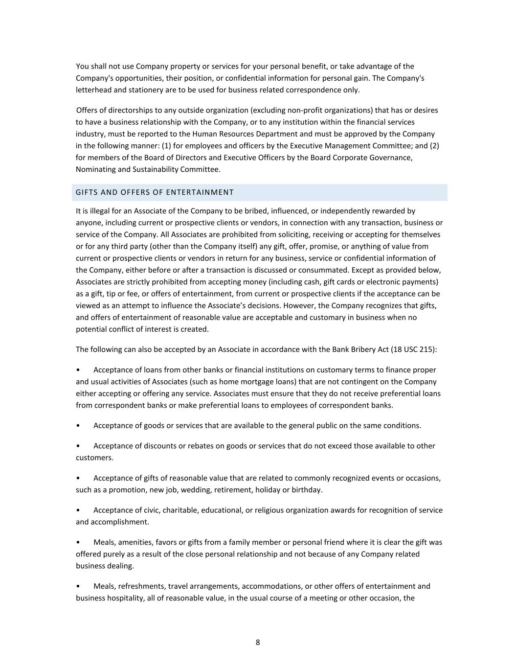 8 You shall not use Company property or services for your personal benefit, or take advantage of the Company's opportunities, their position, or confidential information for personal gain. The Company's letterhead and stationery are to be used for business related correspondence only. Offers of directorships to any outside organization (excluding non-profit organizations) that has or desires to have a business relationship with the Company, or to any institution within the financial services industry, must be reported to the Human Resources Department and must be approved by the Company in the following manner: (1) for employees and officers by the Executive Management Committee; and (2) for members of the Board of Directors and Executive Officers by the Board Corporate Governance, Nominating and Sustainability Committee. GIFTS AND OFFERS OF ENTERTAINMENT It is illegal for an Associate of the Company to be bribed, influenced, or independently rewarded by anyone, including current or prospective clients or vendors, in connection with any transaction, business or service of the Company. All Associates are prohibited from soliciting, receiving or accepting for themselves or for any third party (other than the Company itself) any gift, offer, promise, or anything of value from current or prospective clients or vendors in return for any business, service or confidential information of the Company, either before or after a transaction is discussed or consummated. Except as provided below, Associates are strictly prohibited from accepting money (including cash, gift cards or electronic payments) as a gift, tip or fee, or offers of entertainment, from current or prospective clients if the acceptance can be viewed as an attempt to influence the Associate’s decisions. However, the Company recognizes that gifts, and offers of entertainment of reasonable value are acceptable and customary in business when no potential conflict of interest is created. The following can also be accepted by an Associate in accordance with the Bank Bribery Act (18 USC 215): • Acceptance of loans from other banks or financial institutions on customary terms to finance proper and usual activities of Associates (such as home mortgage loans) that are not contingent on the Company either accepting or offering any service. Associates must ensure that they do not receive preferential loans from correspondent banks or make preferential loans to employees of correspondent banks. • Acceptance of goods or services that are available to the general public on the same conditions. • Acceptance of discounts or rebates on goods or services that do not exceed those available to other customers. • Acceptance of gifts of reasonable value that are related to commonly recognized events or occasions, such as a promotion, new job, wedding, retirement, holiday or birthday. • Acceptance of civic, charitable, educational, or religious organization awards for recognition of service and accomplishment. • Meals, amenities, favors or gifts from a family member or personal friend where it is clear the gift was offered purely as a result of the close personal relationship and not because of any Company related business dealing. • Meals, refreshments, travel arrangements, accommodations, or other offers of entertainment and business hospitality, all of reasonable value, in the usual course of a meeting or other occasion, the