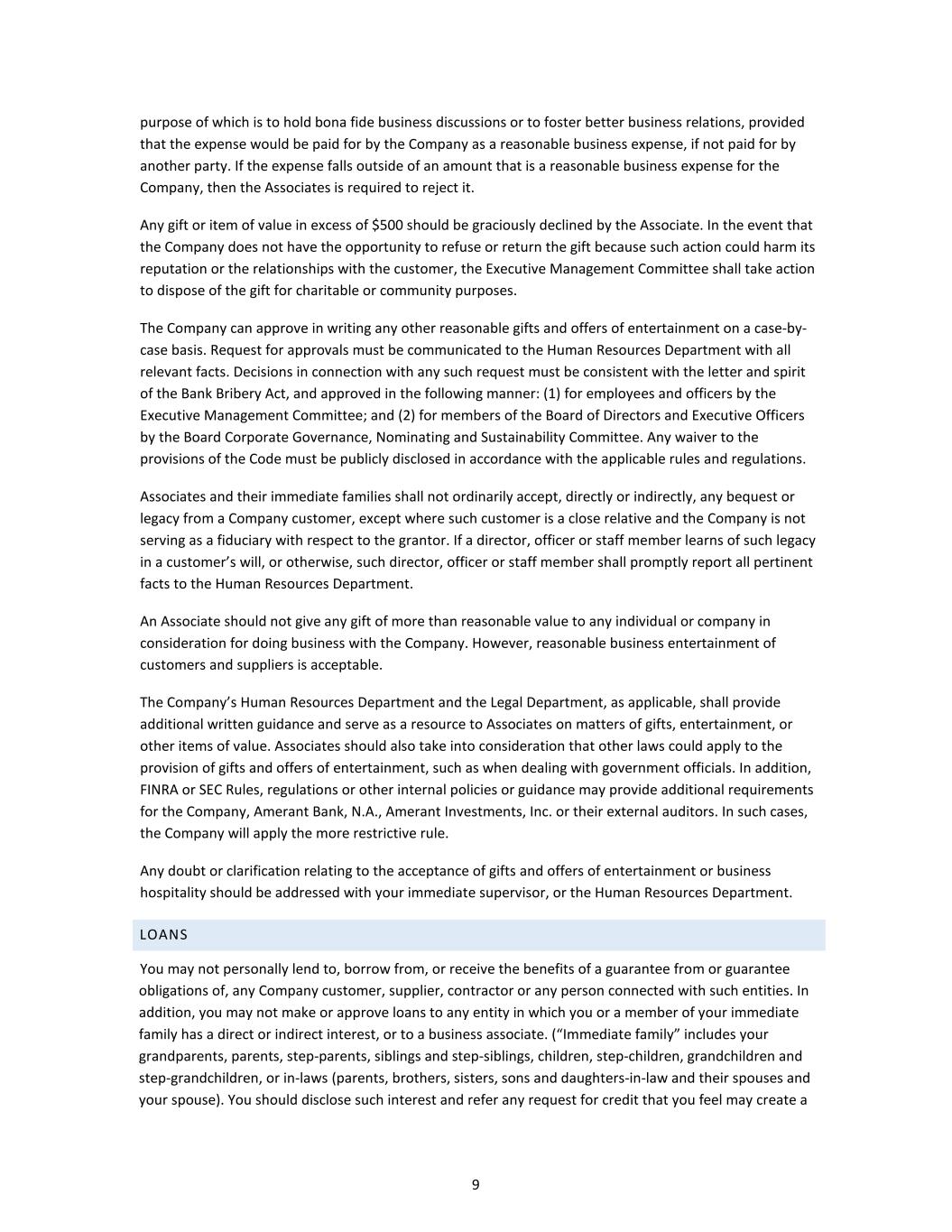 9 purpose of which is to hold bona fide business discussions or to foster better business relations, provided that the expense would be paid for by the Company as a reasonable business expense, if not paid for by another party. If the expense falls outside of an amount that is a reasonable business expense for the Company, then the Associates is required to reject it. Any gift or item of value in excess of $500 should be graciously declined by the Associate. In the event that the Company does not have the opportunity to refuse or return the gift because such action could harm its reputation or the relationships with the customer, the Executive Management Committee shall take action to dispose of the gift for charitable or community purposes. The Company can approve in writing any other reasonable gifts and offers of entertainment on a case-by- case basis. Request for approvals must be communicated to the Human Resources Department with all relevant facts. Decisions in connection with any such request must be consistent with the letter and spirit of the Bank Bribery Act, and approved in the following manner: (1) for employees and officers by the Executive Management Committee; and (2) for members of the Board of Directors and Executive Officers by the Board Corporate Governance, Nominating and Sustainability Committee. Any waiver to the provisions of the Code must be publicly disclosed in accordance with the applicable rules and regulations. Associates and their immediate families shall not ordinarily accept, directly or indirectly, any bequest or legacy from a Company customer, except where such customer is a close relative and the Company is not serving as a fiduciary with respect to the grantor. If a director, officer or staff member learns of such legacy in a customer’s will, or otherwise, such director, officer or staff member shall promptly report all pertinent facts to the Human Resources Department. An Associate should not give any gift of more than reasonable value to any individual or company in consideration for doing business with the Company. However, reasonable business entertainment of customers and suppliers is acceptable. The Company’s Human Resources Department and the Legal Department, as applicable, shall provide additional written guidance and serve as a resource to Associates on matters of gifts, entertainment, or other items of value. Associates should also take into consideration that other laws could apply to the provision of gifts and offers of entertainment, such as when dealing with government officials. In addition, FINRA or SEC Rules, regulations or other internal policies or guidance may provide additional requirements for the Company, Amerant Bank, N.A., Amerant Investments, Inc. or their external auditors. In such cases, the Company will apply the more restrictive rule. Any doubt or clarification relating to the acceptance of gifts and offers of entertainment or business hospitality should be addressed with your immediate supervisor, or the Human Resources Department. LOANS You may not personally lend to, borrow from, or receive the benefits of a guarantee from or guarantee obligations of, any Company customer, supplier, contractor or any person connected with such entities. In addition, you may not make or approve loans to any entity in which you or a member of your immediate family has a direct or indirect interest, or to a business associate. (“Immediate family” includes your grandparents, parents, step-parents, siblings and step-siblings, children, step-children, grandchildren and step-grandchildren, or in-laws (parents, brothers, sisters, sons and daughters-in-law and their spouses and your spouse). You should disclose such interest and refer any request for credit that you feel may create a